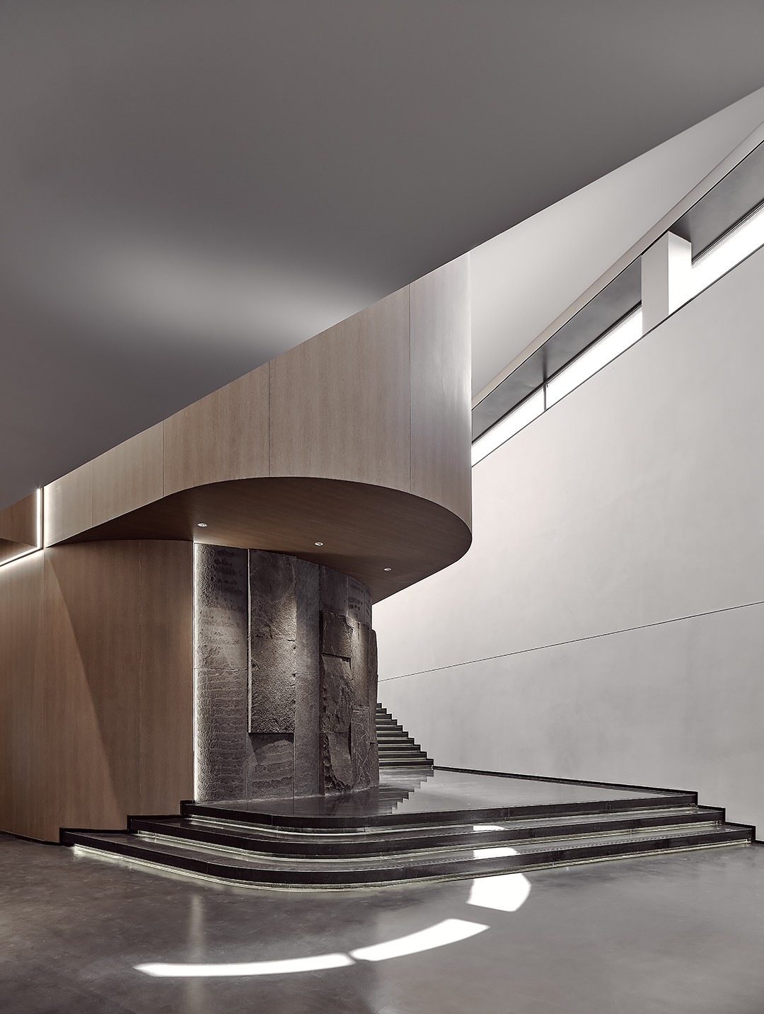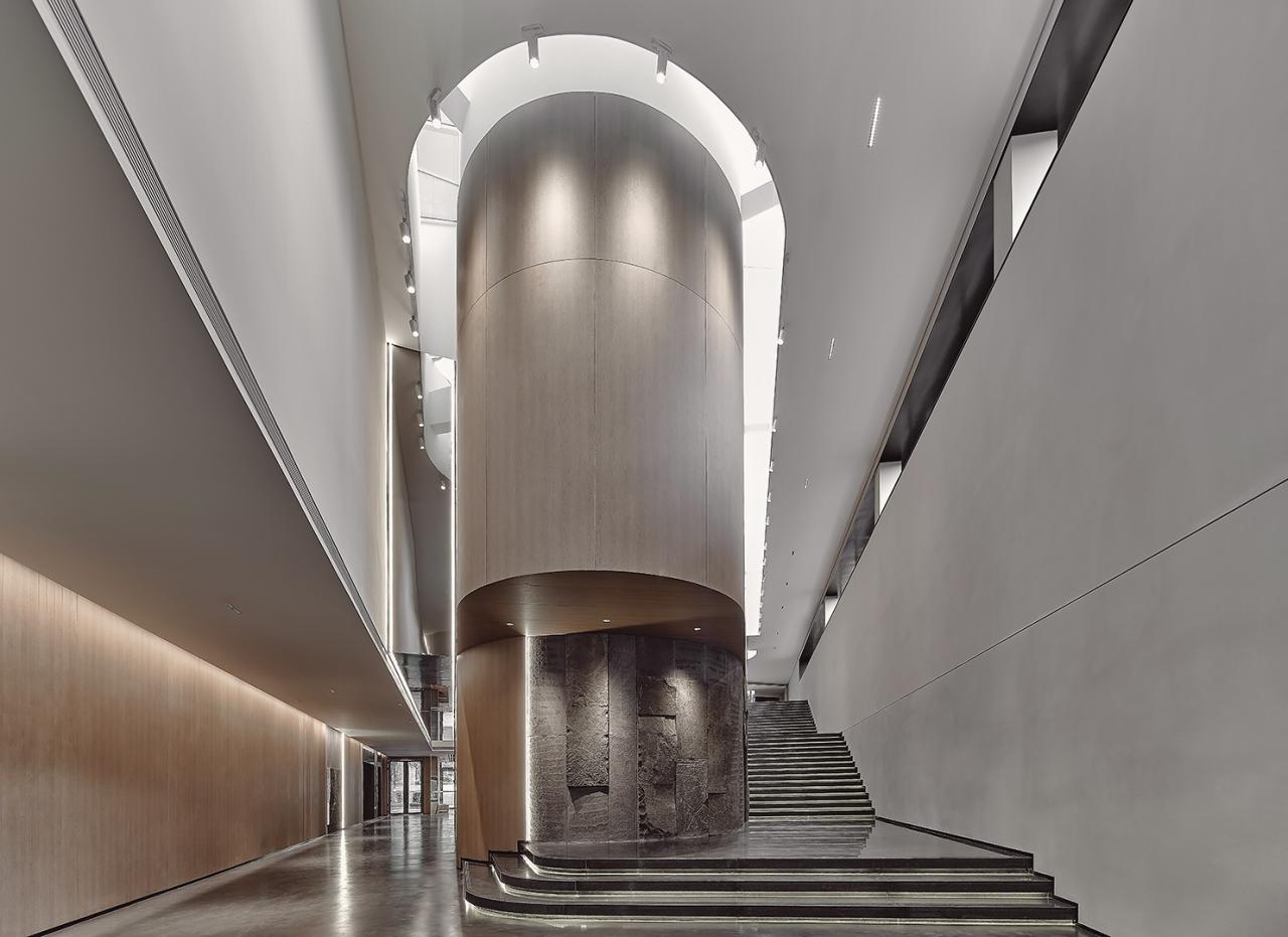 富有雕塑感的楼梯成为了空间中的视觉焦点,同时搭配暗色系的台阶步道,厚重而不失致趣。