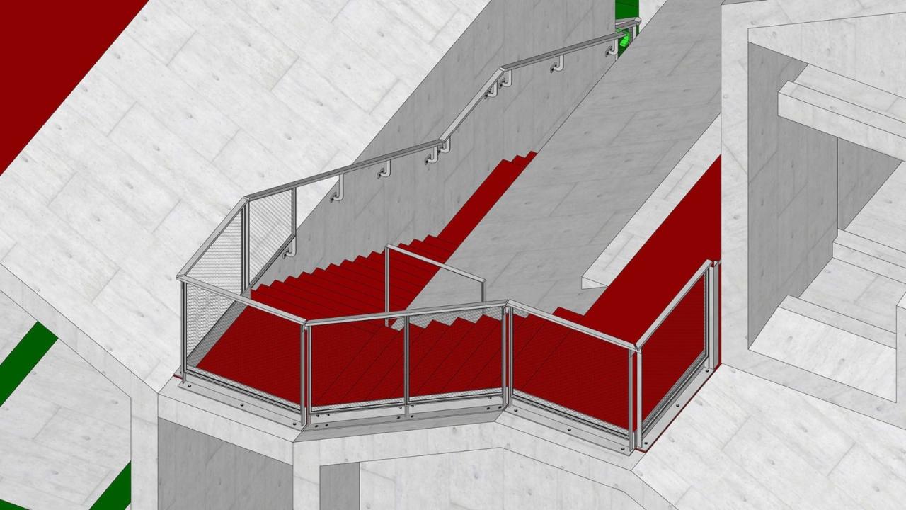 其他设计栏杆设计往往是容易被忽视的部分,那些一不小心就被设计院引用了锃亮的不锈钢栏杆详图并且没人觉得不好的故事在以前政府项目中屡屡发生。这次我们考虑海边的特殊气候,全部采用了拉丝不锈钢材质表面氟碳喷涂,而且为了清水混凝土的完美,全部采用了后埋件的做法,为此我们也为每个埋件做法绘制了详图,并且栏杆段充分考虑了标准化的设计,这样可以减少工人的犯错概率。