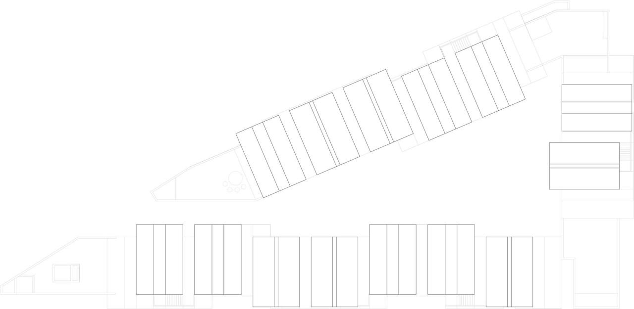 后来综合两种模式的特点设计出了一种错开的叠合模式,上下一共三十个盒子,出入口互相独立分开,这样除了解决了这个狗和狗的过多相遇的问题之外,还创造了非常不同的建筑造型,同时拉开的房子之间处理成楼梯并提供地下室食堂的自然采光。在盒子另一侧,因为有进有退,所以部分客房为了避让楼梯就产生了跌级的立面造型,同时也为客房室内的跃层楼梯提供了基本骨架。