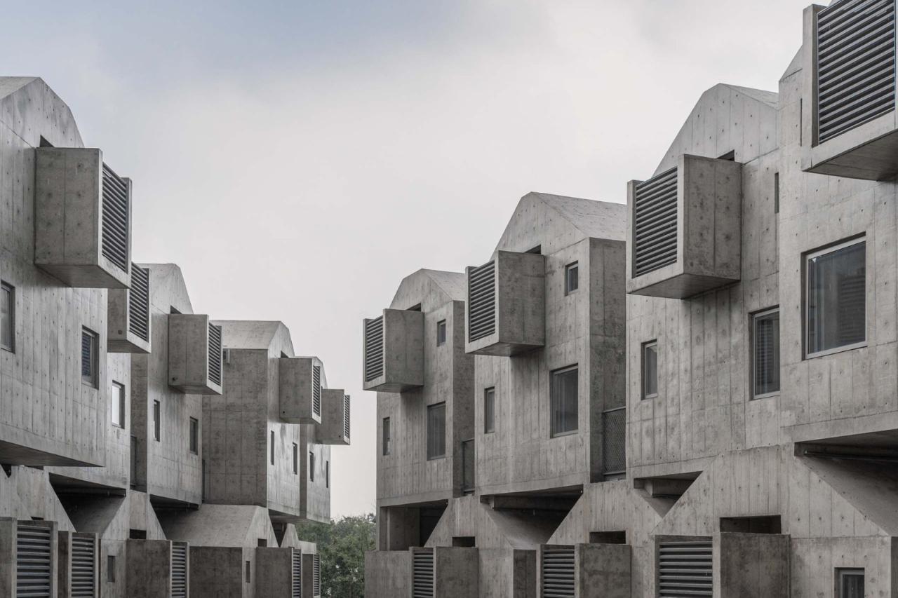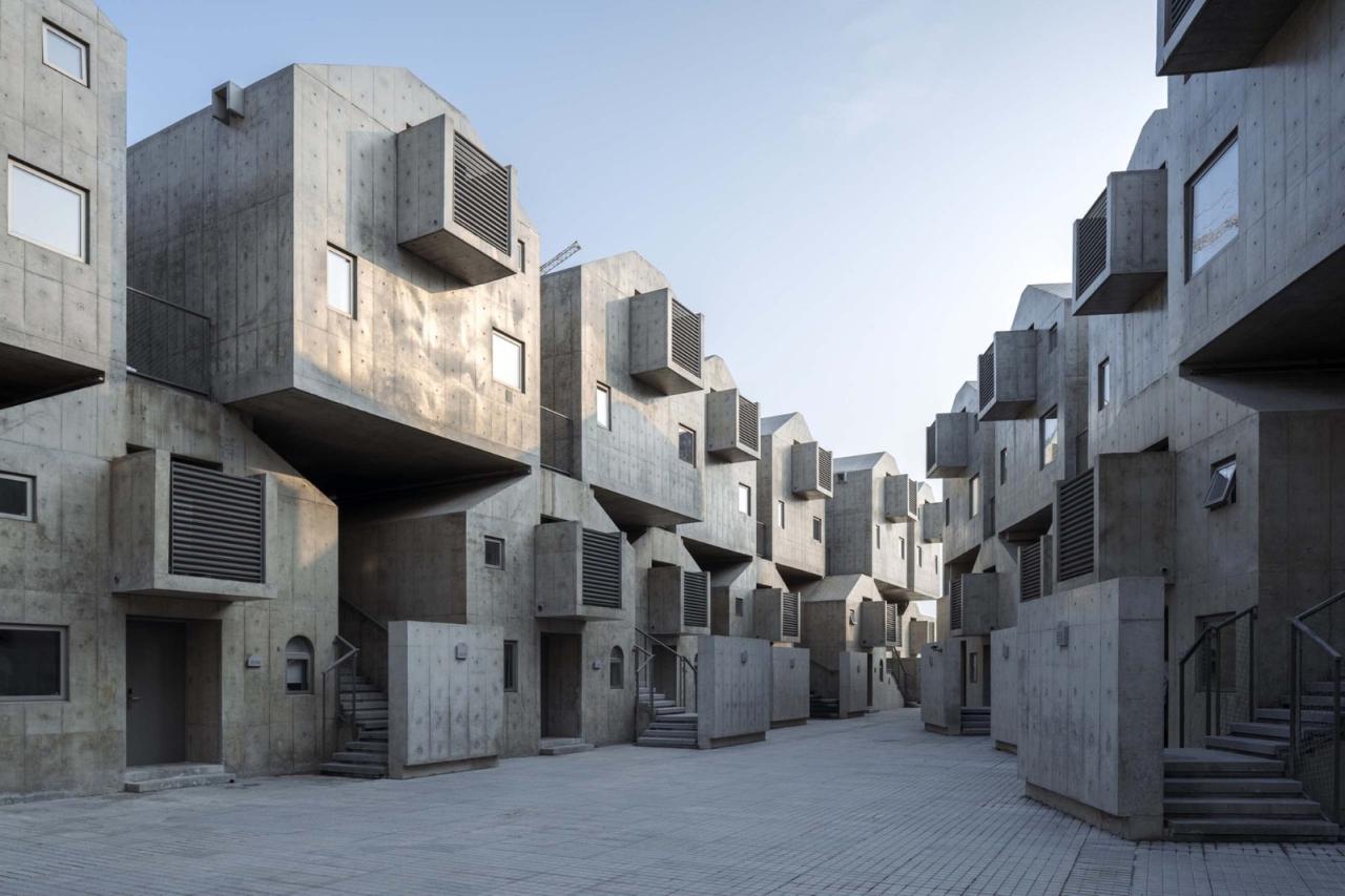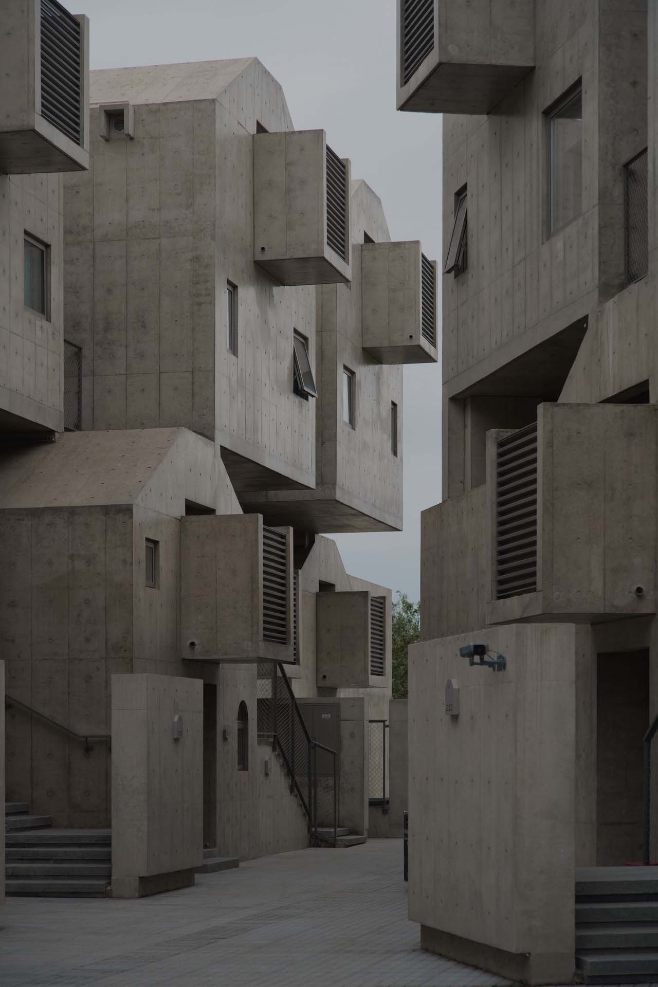 为此我们还做了一个大比例的混凝土实验,位置在阿那亚南门,这个实验品就是概念化了的一个客房盒子,房子不会浪费,未来可改做南门的门房。等浇到尖屋顶的时候,我们发现我们低估了这种非横平竖直的造型浇筑的难度,比如那个屋“尖儿”就很难浇,只能抹。经过是否预制等技术措施的讨论,我最终放弃了尖顶,改为留有一个小平面的梯形屋面,所以最终犬舍客房有两个屋顶形状,一个是大平顶,一个是小平顶。后期所有的混凝土修复、防水抗渗以及内保温、门窗实样、空调百叶及栏杆都在这个一比一大样上过了一遍,并且在后面正式施工的一年多时间里还继续接受着时间的检验。
