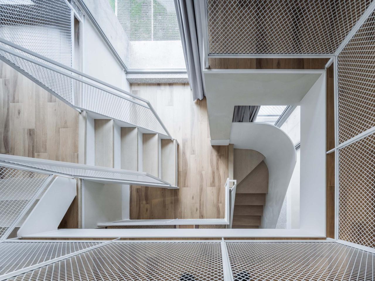 由于初始设计中就限定了每个客房盒子的尺寸为6米×9米的基本型,所以30间客房基本上是在这个尺寸控制下,由入口方向及外立面跌级的不同影响而衍生出来各不相同的室内空间,总共分为四个基本型。在设计过程中,加上四个基本型之外由于位置和进退的不同而产生的微小变化,最后导致了更多的设计结果。前面说过了,室外楼梯对客房形体的影响,基本决定了室内楼梯的走向,所以后来的室内楼梯设计基本上是在几个标高上找公约数算尺寸,这样楼梯变成了室内的一个装置,不但成为了上下的交通核心,还串联了几个供人和狗产生趣味停留的几个小空间。