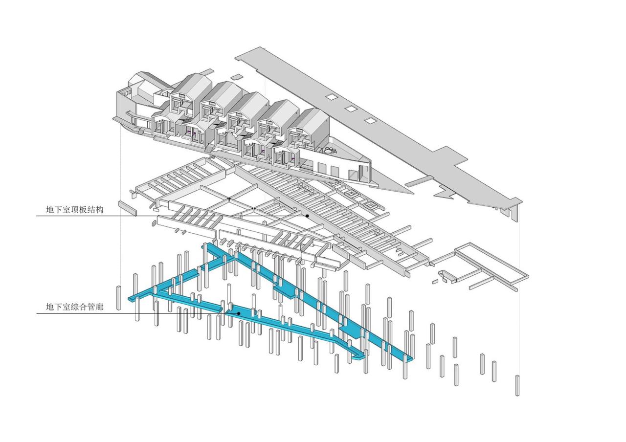 结构设计追求完美的建筑师都对于空间形式的建构逻辑有着近乎洁癖的追求,也就是这样的非框架式建筑造型在最初设计结构的时候最不想出现上下对齐的框架柱,而最好全部是由板式结构来完成(憎恶梁柱而迷恋厚板这个建筑们特有的喜好不知道从什么时候开始的),垂直的剪力墙加斜向的结构屋面板共同形成一个盒子叠合的“板式框架”,这也是最初结构顾问张准建议的。这种上下不对齐的结构体系虽然完美,但对设计和施工要求很高,并且还要进行施工图的结构超限审查,费时费力还不一定能够完全实现。考虑到我并不是接了一个马寅不在乎时间不在乎成本的“小型精神建筑”的活儿,而是一个要考虑时间及成本的商业建筑,所以,犹豫再三,就放弃了建筑师的所谓极致追求,选择了隐藏式的框架结构,利用上下两个盒子的微小的叠合处来寻找框架柱的位置,再用一些建筑手段,让柱子基本消隐在下层客房的空间里。地上的框架部分只在地下室顶板处进行结构转换。