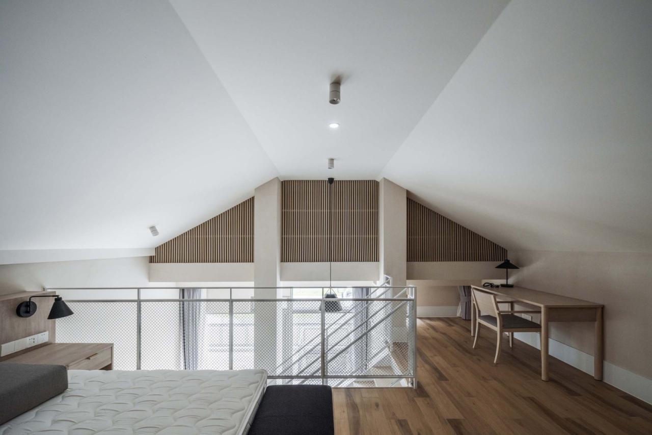 床的布置也经历过靠边布置还是居中布置的纠结,最终还是选择了靠边布置的常规做法。除了楼上的大床以外,楼下也布置了一个榻榻米空间,提供多种家庭结构和人狗关系使用。两层客房都有卫生间,但是二楼由于坡屋面的原因,一些现场尺寸和图纸不会完全一致,所以在竣工前还调整了浴室和马桶的位置,以保证人的正常使用。