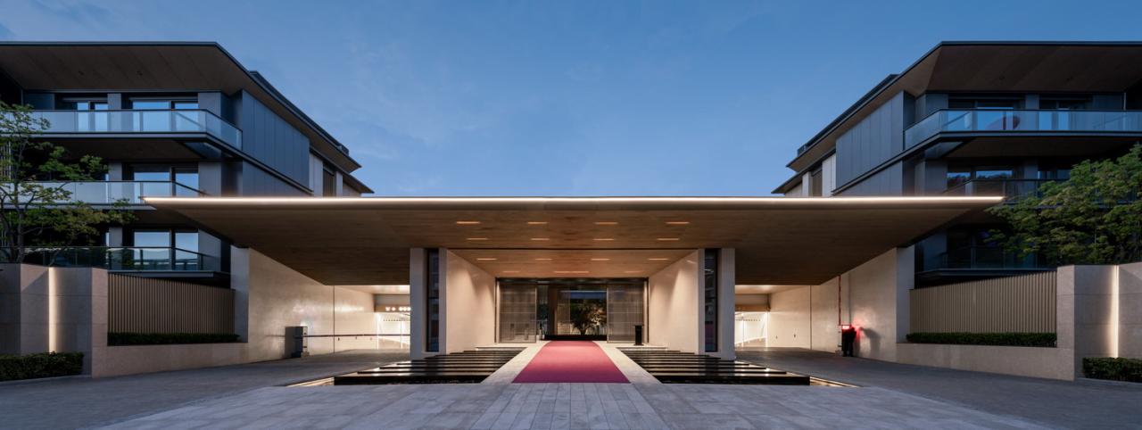 社区南侧临接城市支路。步行主入口以多层次的院落序列塑造从外到内的过渡。整个入户序列深约70米宽约30米。建筑师在这里塑造了一串类同度假酒店入场前区的行进体验,框景、游廊等手法的运用借鉴了东方传统中对于自然的观游态度。