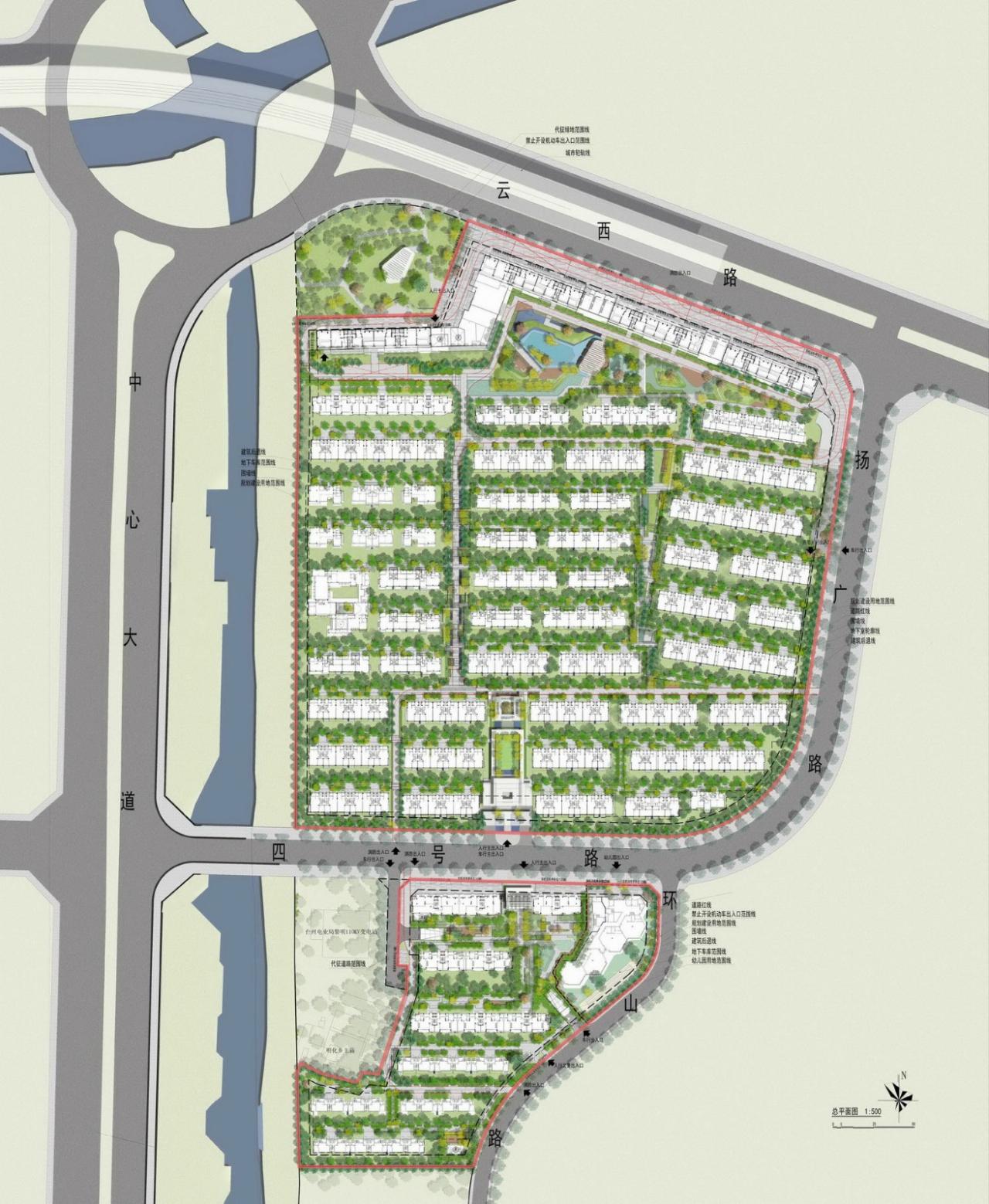 江南墅包括高层、洋房、叠墅及联排等多种产品。建筑师以“共享且独立”的原则进行总图规划,通过有序的公共系统将各类产品组织起来。自北往南依次安排高层、洋房、叠墅及联排。北侧高层与洋房自成一个围合组团,高层建筑被坚持控制为单排。