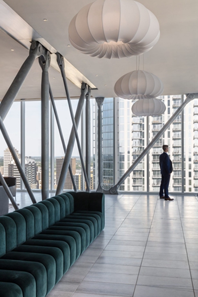 这座塔楼的形状受到各种场地限制的影响,包括一条不可移动的公用事业管线和一条由奥斯汀国会大厦景观走廊保护的地平线。位于34层的一个舒适的平台,悬臂式地或突出在城市之上。从地板到天花板的玻璃窗墙,让平台上有奥斯汀的360度视野。由于拥有高效的暖通空调系统,该塔楼能够在一年的大部分时间内有净能源中性功能。