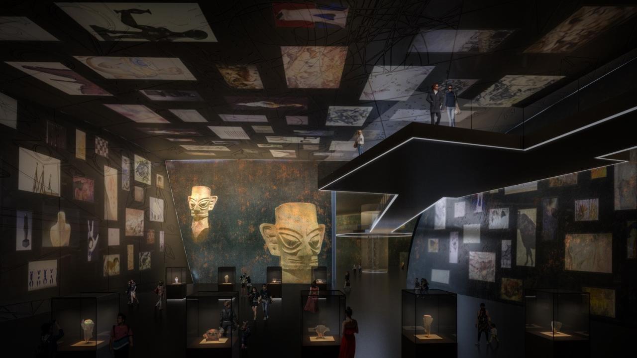 提取三星堆文物上灵动有张力的曲线和抽象的符号,运用堆叠、整合,转化的手法制作出现代复合的建筑表皮。以文物上金与铜的肌理,经过转译保留特质,进而形成公共空间轮廓的表皮材料,像神秘的面纱覆盖于建筑之上,这些材料与形式唤起了特定地域的场所记忆,一同构成了建筑的人文特质。三星堆文化将以全新的方式覆盖于博物馆的空间布局、形态处理、材料运用和工艺传承上,古老的文化将以新的形式拥有新的生命。