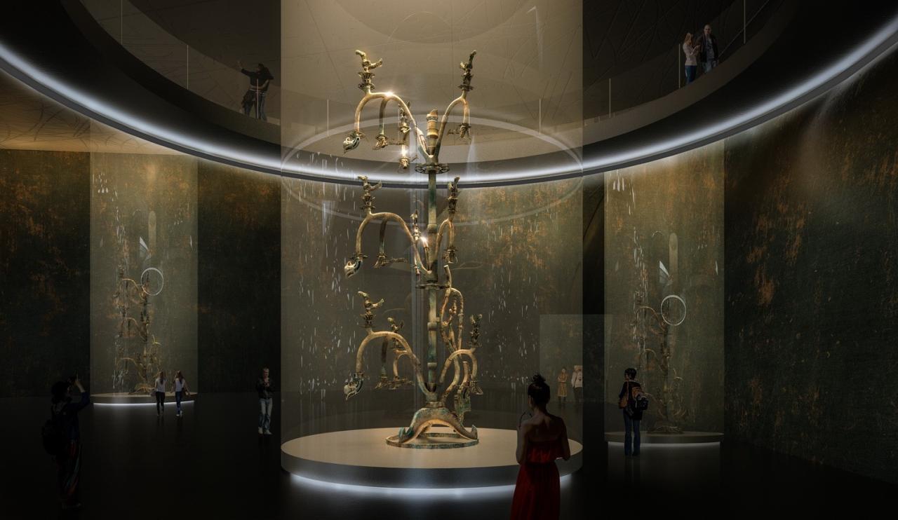 参观者经过城市道路进入与遗址公园相连的园区规划道路。三星堆博物馆的整体设计以永续发展的视角,将整个园区视作生命之树,通过设计梳理它的主干和枝叶。三星堆文物通天神树将转化成博物馆区重要的功能流线,新的轴线有序串联所有参观点。清晰的内外流线,将办公、参观、货流等部分清晰分流,同时重新规划了人车分流的双动线,将主轴线移至北侧,参观者经游客中心,沿主轴依次进入各馆参观游览。