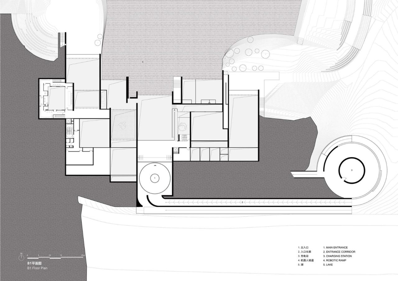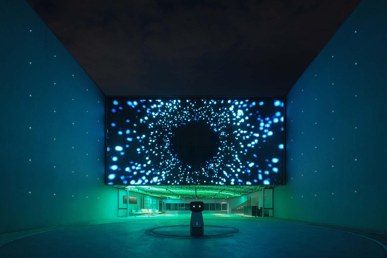 在AI PARK 入口处,设置着机器人充电台,停靠着待命的各类机型。参观者由此被机器人带领穿越甬道,到达一个围合入口庭院,仿佛来到另一个时空。然后和机器人一起走进AI PARK中展开探索。