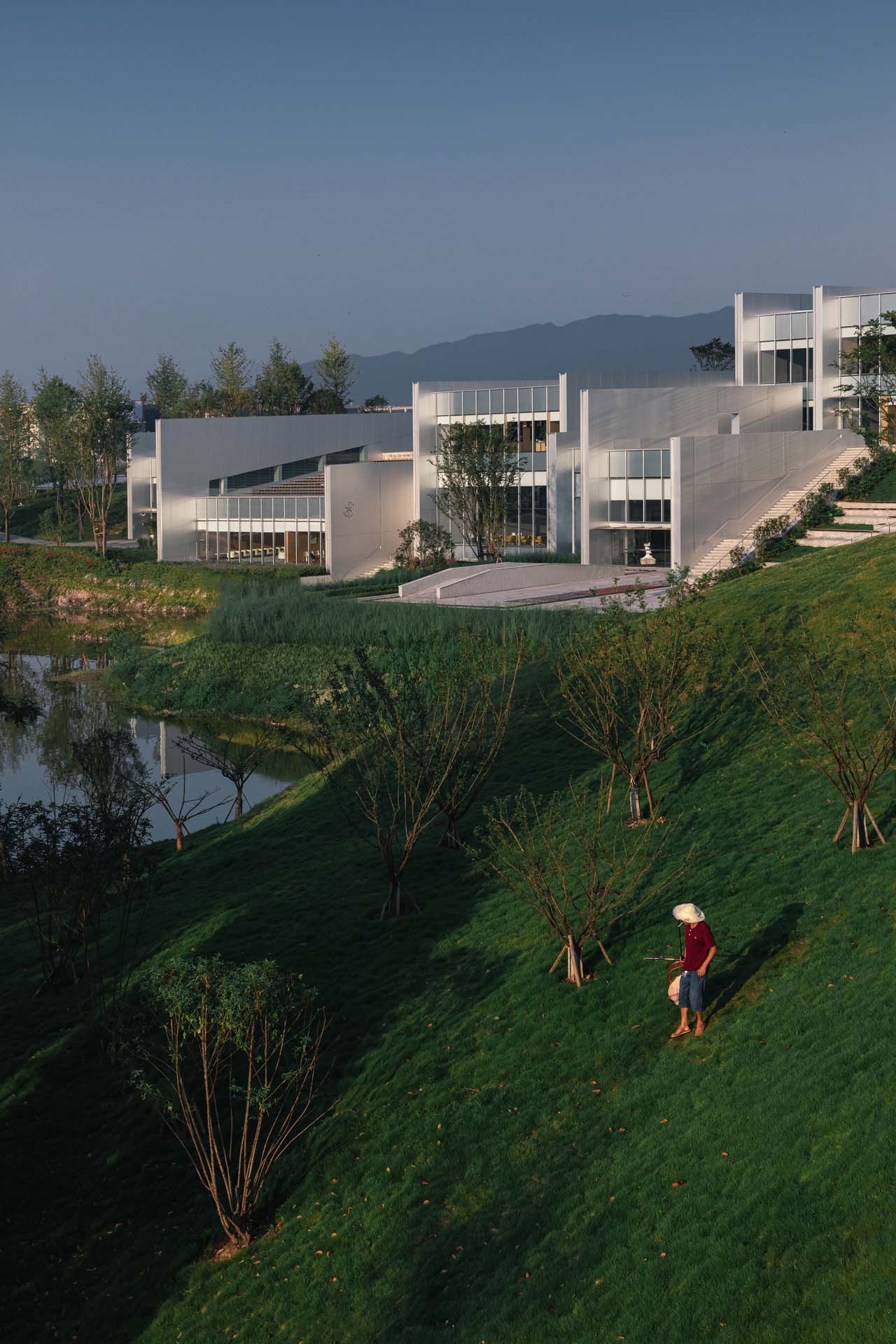 嵌入大地的“芯片”AI PARK 位于重庆高新区凤鸣湖畔,由一组金属墙排列而成,像 “芯片”一样插进起伏的地形之中。这些墙体集成了机器人坡道,硬件设备,服务器,管线风口和支撑结构。墙与墙之间则能自由构建实验室所需要的空间。墙体垂直于水岸,依地势错动。院落和实验室夹在墙之间,相互串联,都有朝向水面的通透视野。“嵌入大地的芯片”表达了特斯联的使命——万物互联,构建城市物理空间的智慧系统。这就是特斯联的“AI CITY”。这不仅是构想,它已经付诸实践。