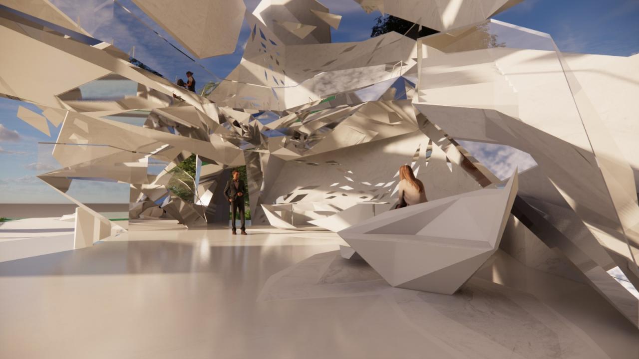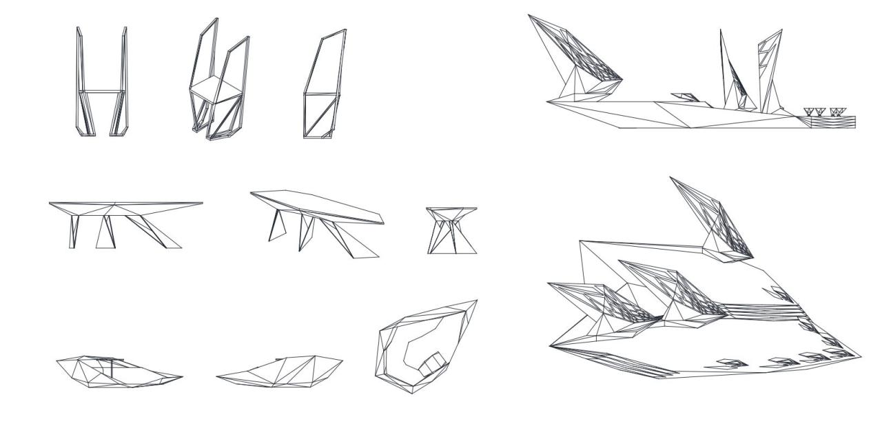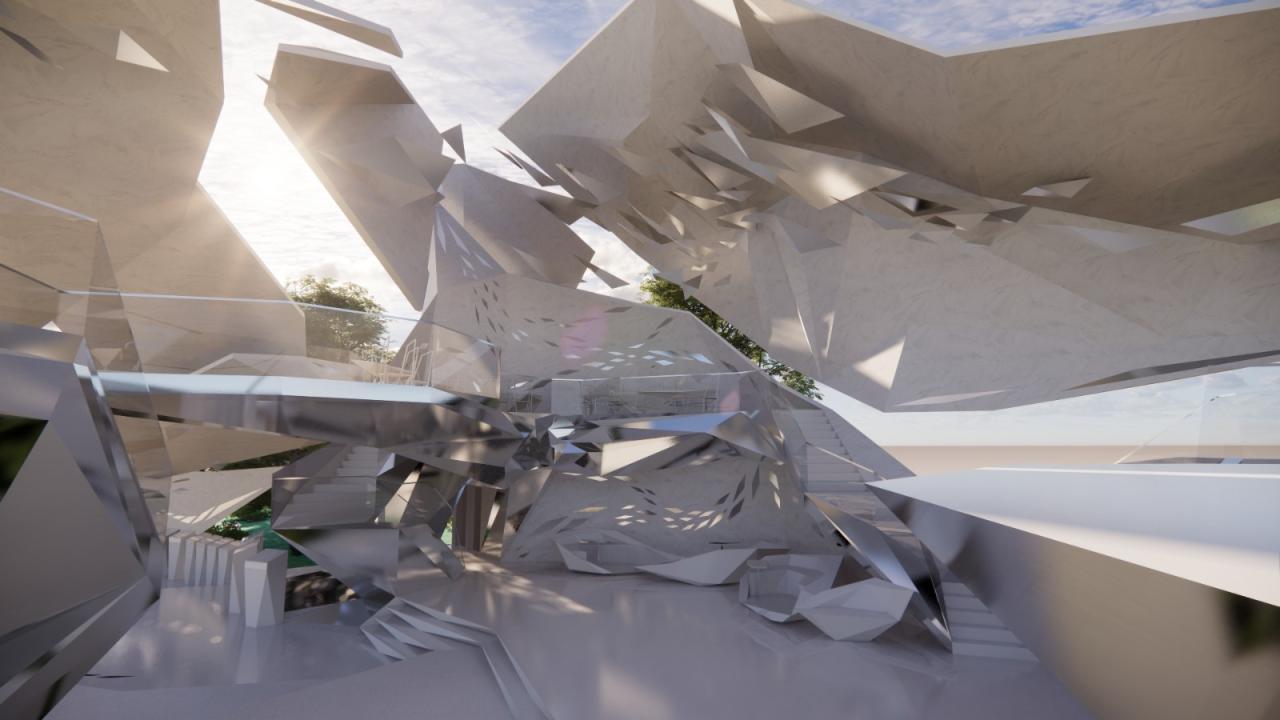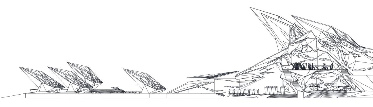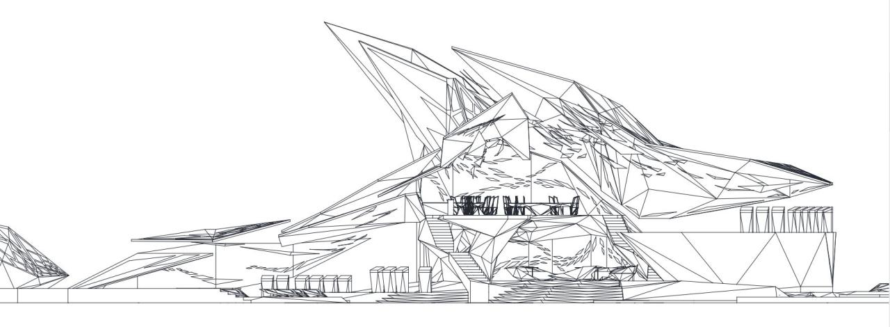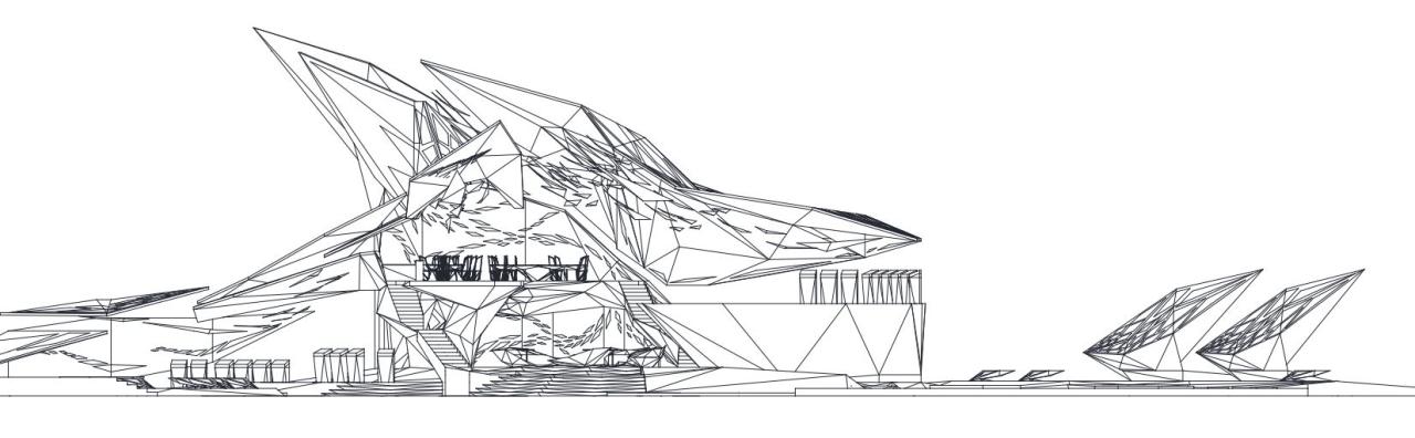 在立面生形过程中,选择以一种由内到外的生形办法进行空间生长,可以是从核心区域甚至是一个家具开始生形,并扩散到建筑物,最终到达至景观,一切都是由内到外以一种生长的方式进行爆炸。它赋予形式更大的自由与可能性,也使得空间的生长更有弹性,它不同于传统先确立大关系再步步内推的僵硬、死板、紧缩的造型方式,由内而外的生形手法赋予建筑体更大的生命力。内生形不仅拓展了造型的可能,它也是服务于设计师的,这样的办法促使设计师更轻易也更连贯地追随和捕捉他的想法。它同样是一个契合人类思维生长的造型工具,一切都是一气呵成且贯气的,它最大限度地提供了物体以一种近似宇宙爆炸的方式进行美的生长。