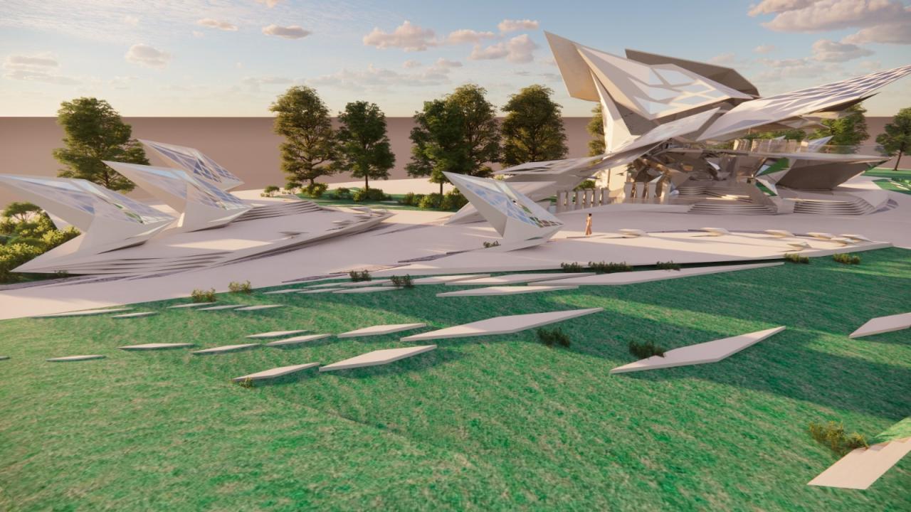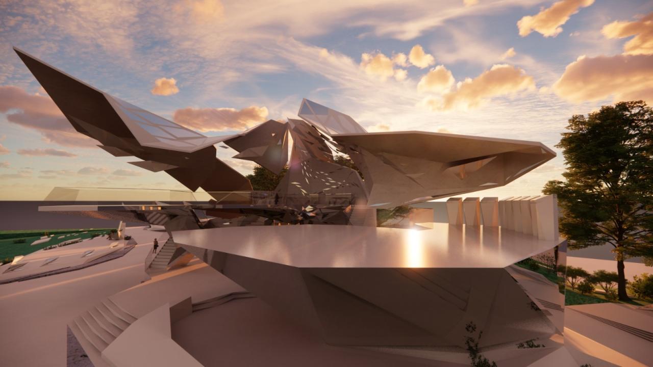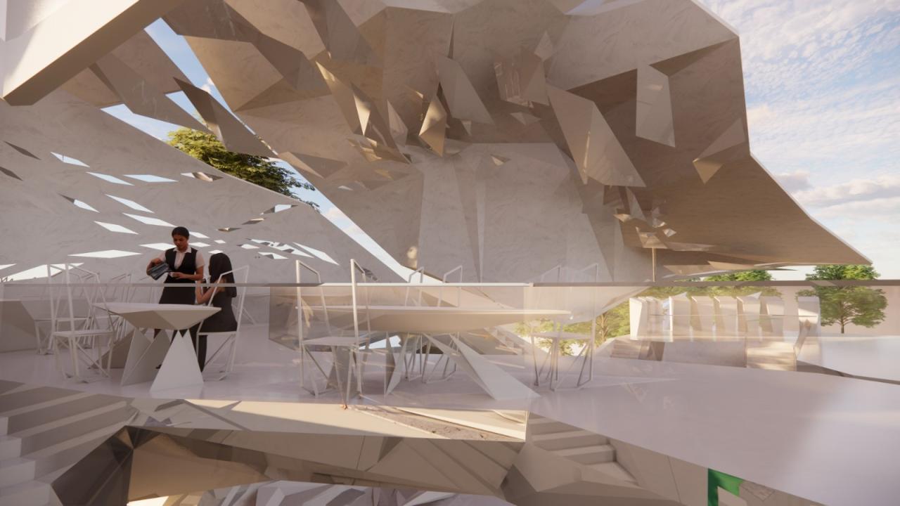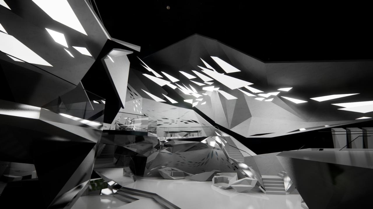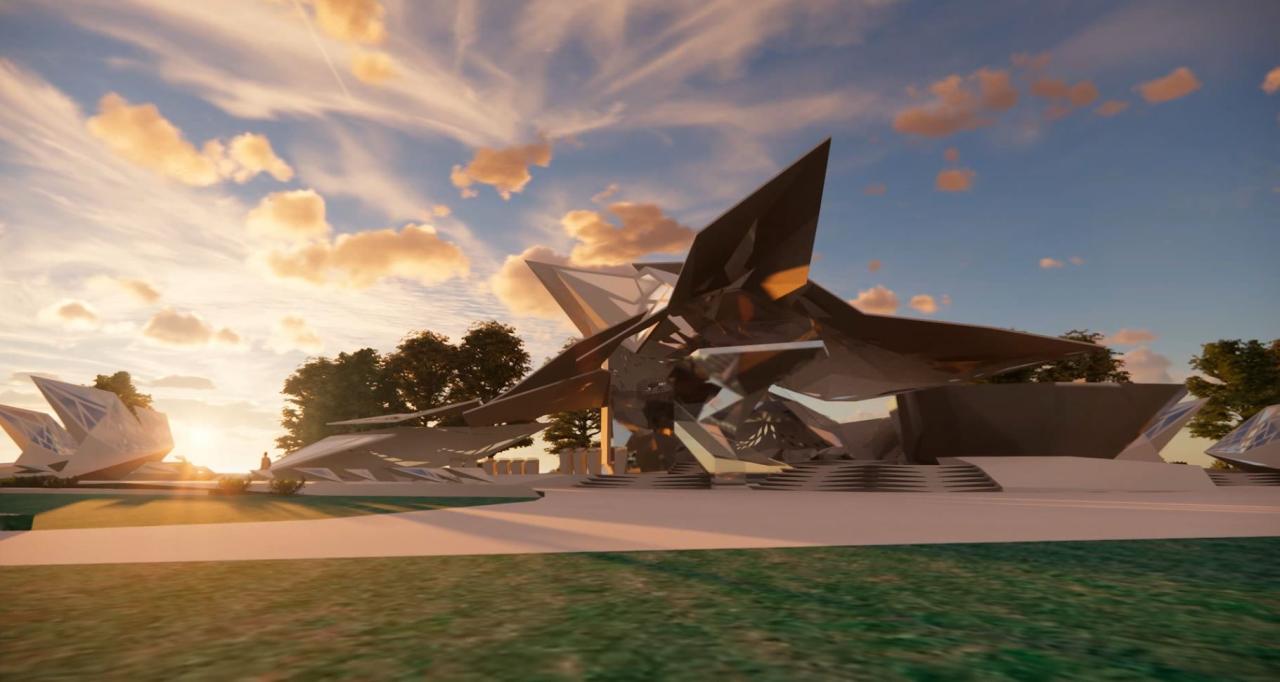 在立面生形过程中,选择以一种由内到外的生形办法进行空间生长,可以是从核心区域甚至是一个家具开始生形,并扩散到建筑物,最终到达至景观,一切都是由内到外以一种生长的方式进行爆炸。它赋予形式更大的自由与可能性,也使得空间的生长更有弹性,它不同于传统先确立大关系再步步内推的僵硬、死板、紧缩的造型方式,由内而外的生形手法赋予建筑体更大的生命力。内生形不仅拓展了造型的可能,它也是服务于设计师的,这样的办法促使设计师更轻易也更连贯地追随和捕捉他的想法。它同样是一个契合人类思维生长的造型工具,一切都是一气呵成且贯气的,它最大限度地提供了物体以一种近似宇宙爆炸的方式进行美的生长。