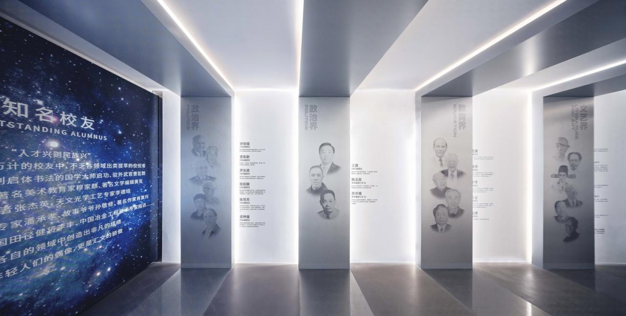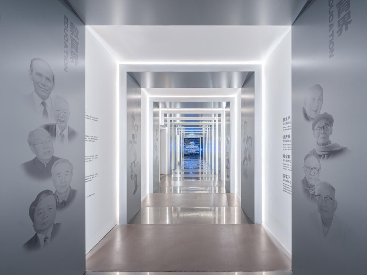 展览的最后,是一个由金属和光组成的未来长廊,长廊中展示着活跃在各界的汇文校友。长廊的尽头是一面镜子,延伸着长廊也照见了观者自己,汇文的未来不正是在于镜子中的每一个人么?他们在学业和教学上的进展,他们在各行各业的进步,都构成了汇文可以无限遐想的光辉未来。