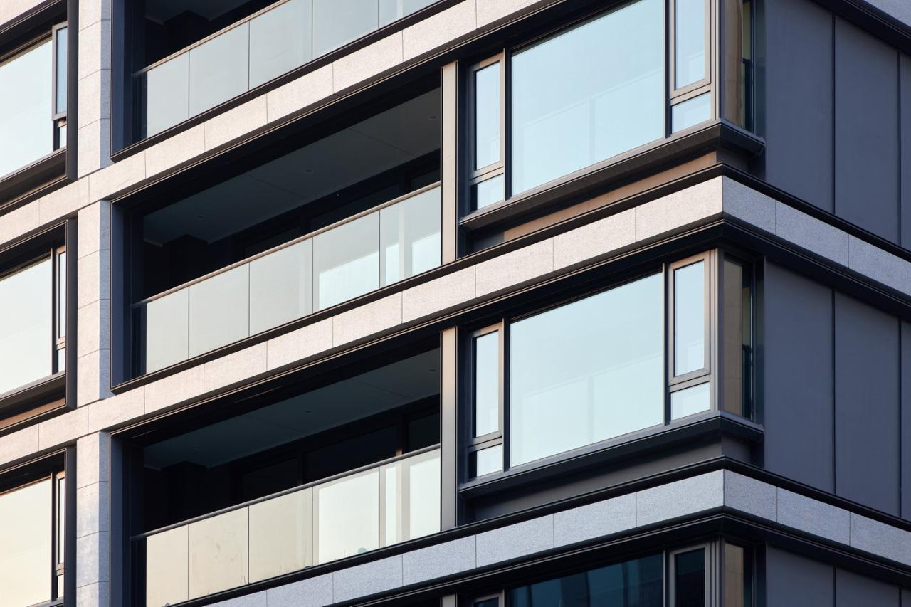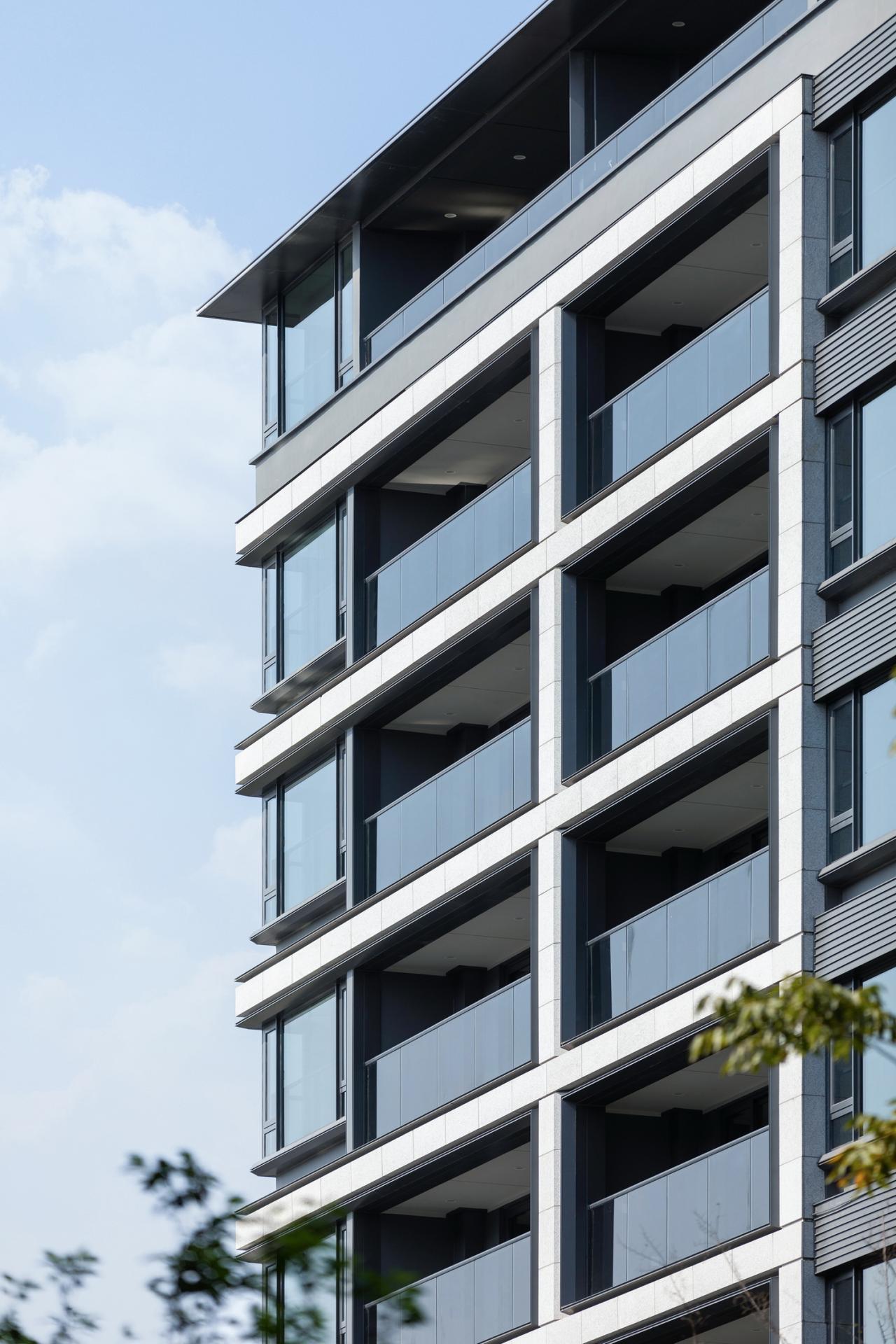 出于立面整体性的考虑,常规做法通常会首选玻璃或百叶等材料对飘窗基座进行遮挡美化。但是我们选择摒弃多余构件,将飘窗自身的构造特点在立面上自然呈现,并在飘窗板端部以精致线条收口,内凹部分应用铝板同色涂料。最终所呈现的效果,自然镂空的飘窗在立面上形成了第二道层次,而转角飘窗的开口设计也更凸显轻盈灵动的形体感。