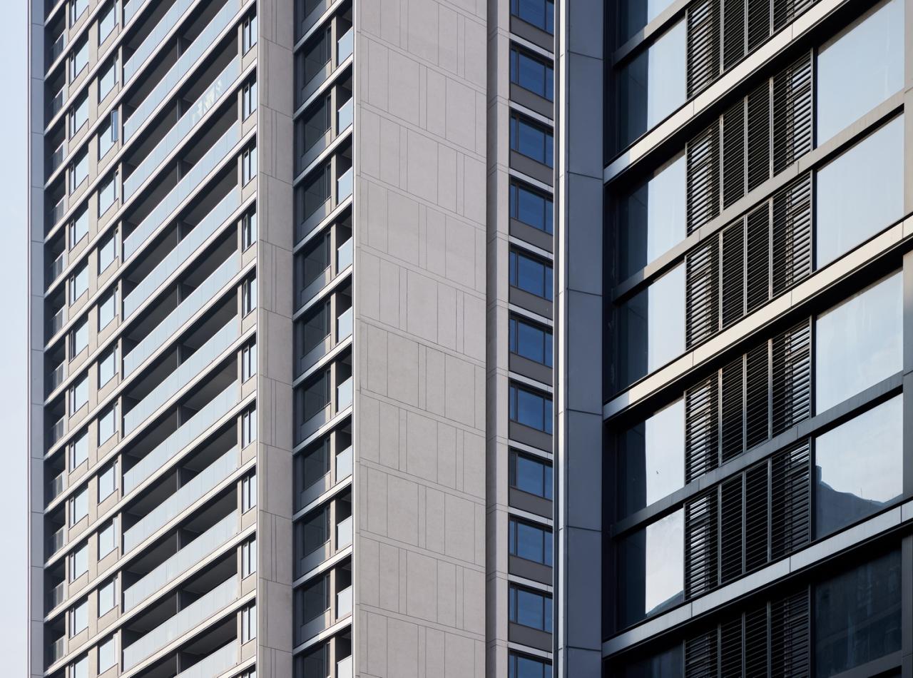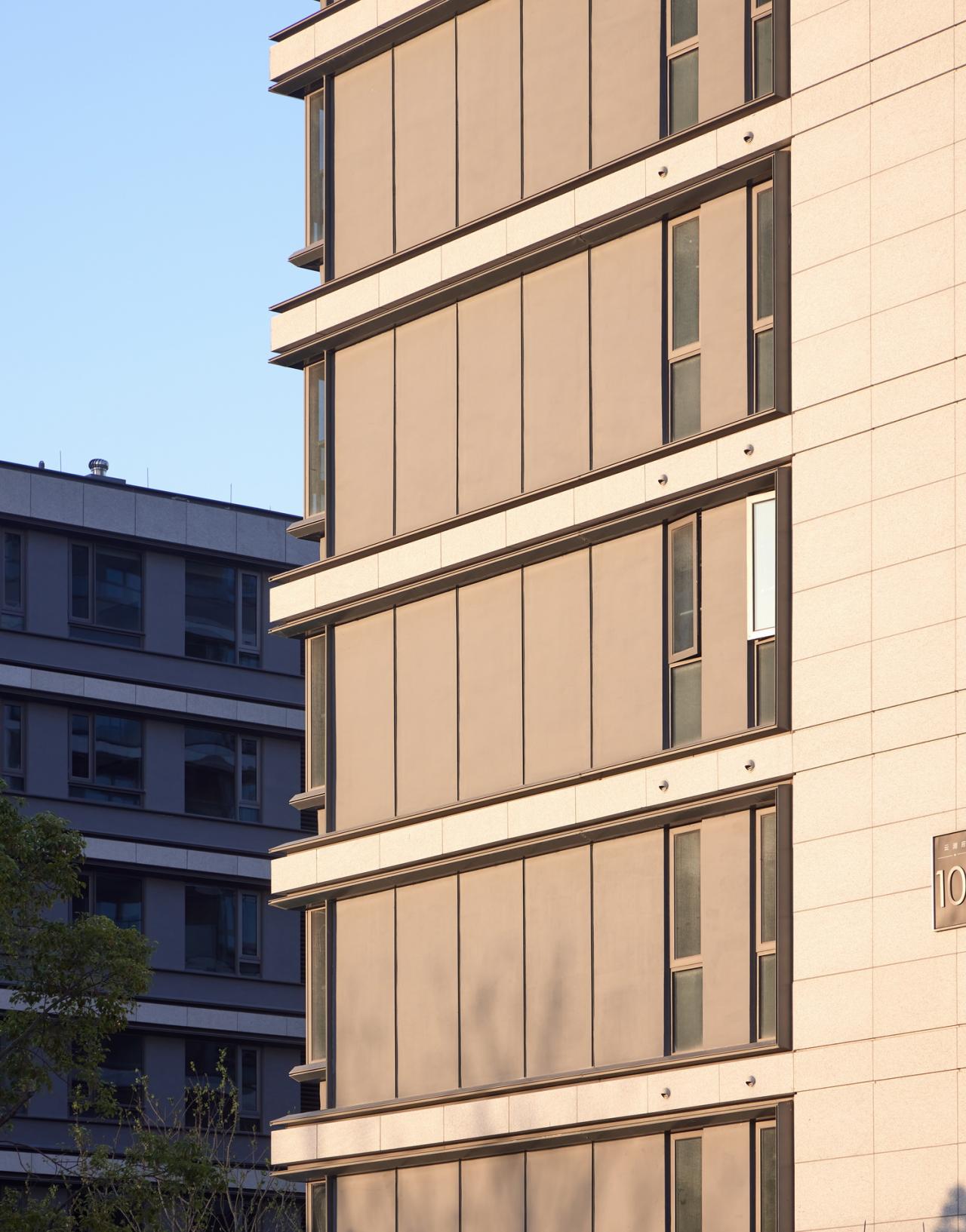 高层南北面以玻璃与铝板作为立面主材料,而山墙面选择仿白麻石材效果的涂料,在主次立面交接处以浅色金属型材作为收口过渡,做出精致挺拔的收边效果。仿石涂料面通过有韵律感的分缝设计,以及不同仿石纹理的反复挂样推敲,最终在次要的山墙面用涂料做出了石材般质感的外观效果。