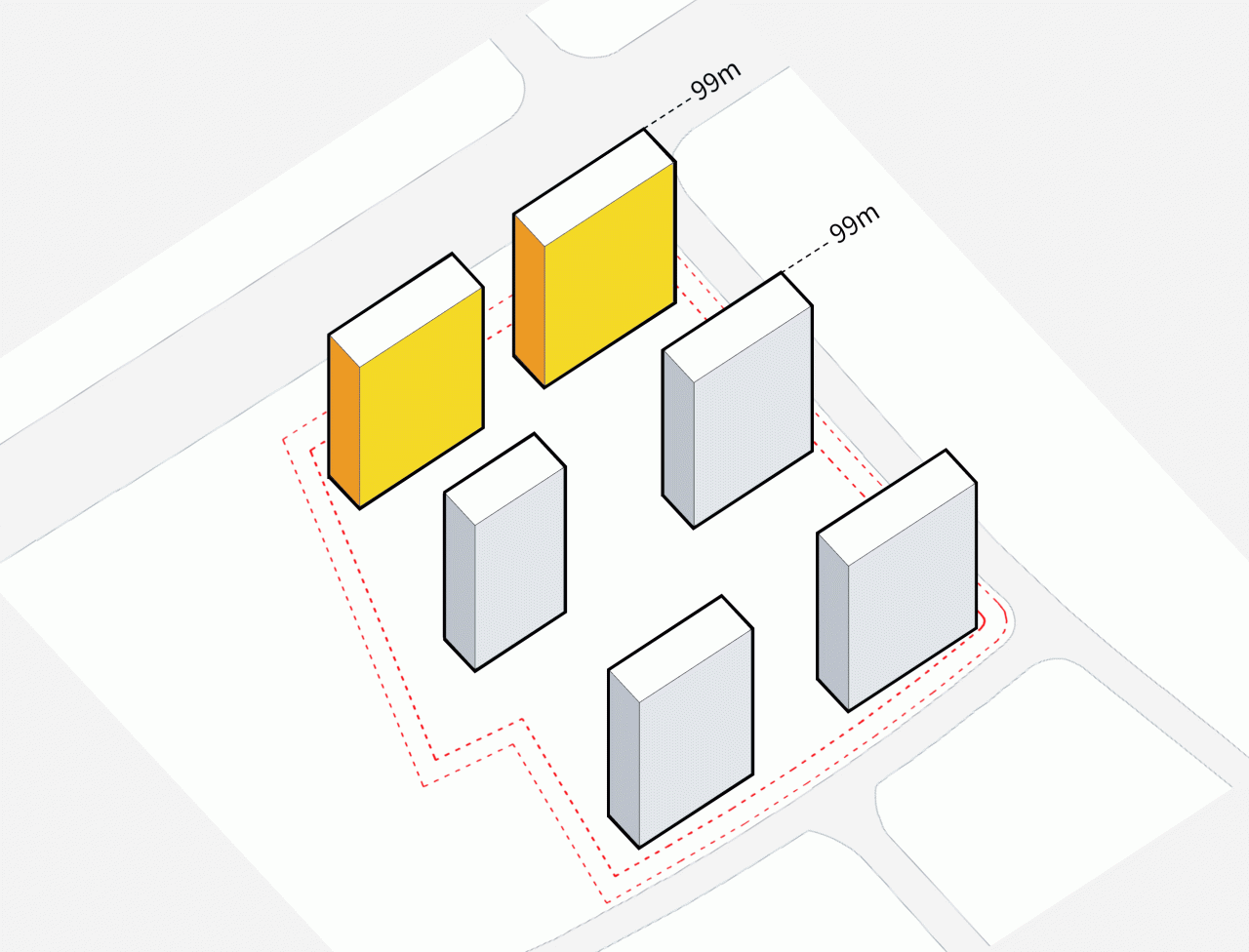 项目启动初期,我们对项目地块进行容量测算,若将住宅与公寓同质化布局,在符合日照和间距的前提下,基本会形成百米高公寓和18层小高层住宅的社区布局。基于市场上多层洋房和高层公寓两大产品的具差异性的销售单价,我们针对地块特性和指标条件,将不同产品形成差异化布局,寻找符合地块条件的最佳组合,以实现总销售货值的最大化。