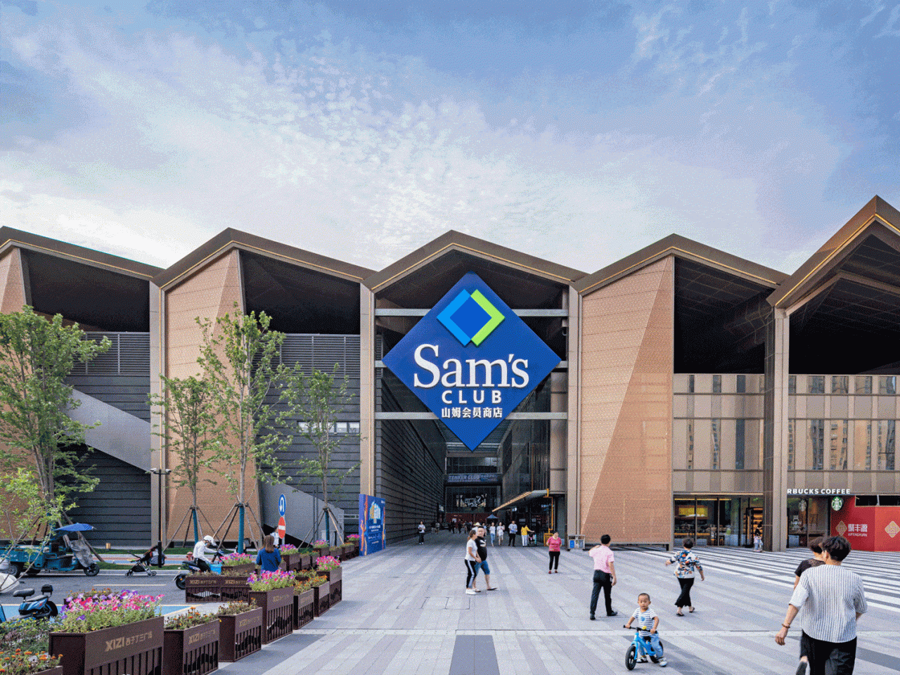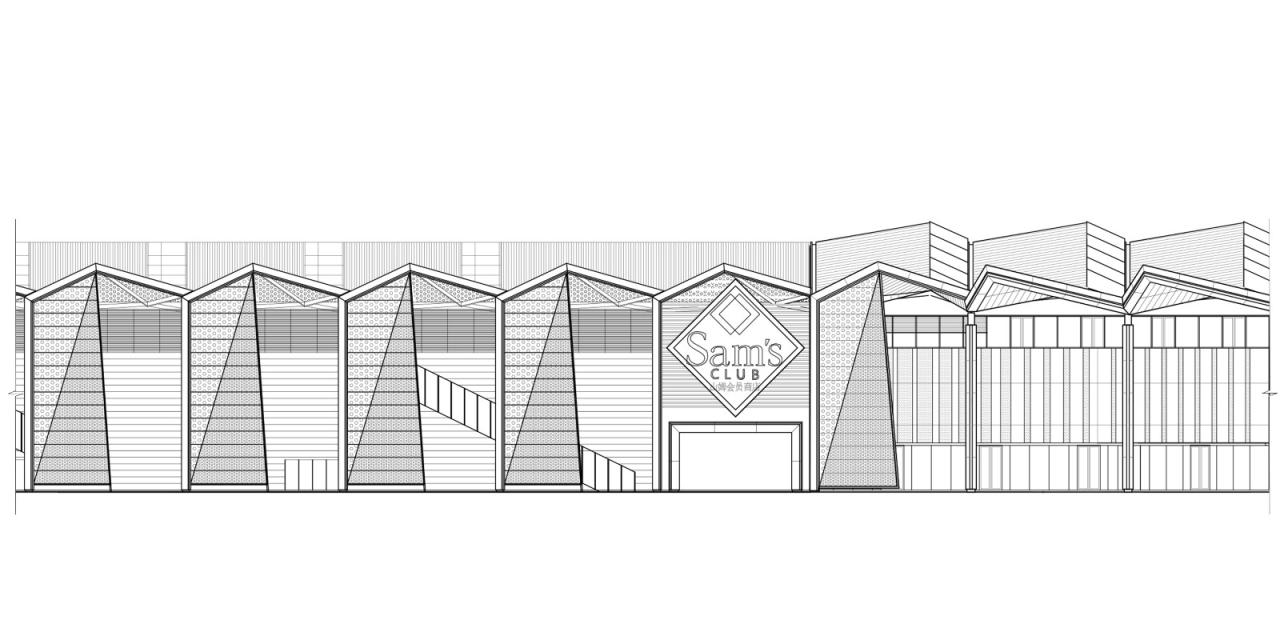 设计方案保留了既有的钢结构及柱跨,重点进行功能置换和表皮重构。置入功能包括约2万㎡的山姆会员店、3万㎡的集中式商业及2.7万㎡的停车楼。原有的彩钢板屋面更新为红褐色金属屋面,通过“裁切-翻折”的手法,建立以12米为模数的锯齿状天窗体系;立面上的折板造型形成虚实韵律,改善既有厂房沿街面单调、冗长的面貌。