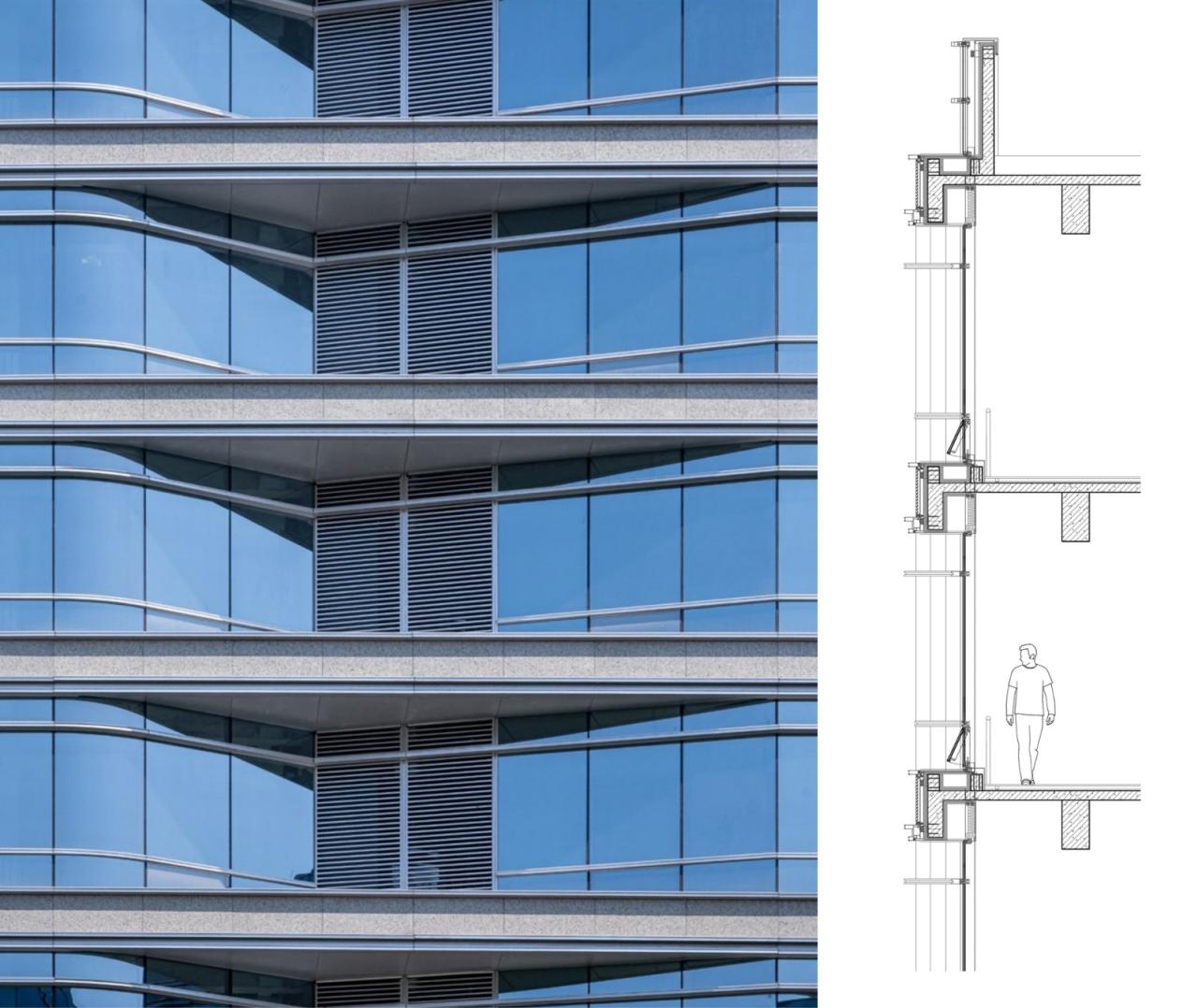 立面构件吸取其他类型建筑的营造经验。注重以细腻的尺度建立与人感知间的关联。在大的划分之下,以细金属件建立第二、第三层次。雨棚等元素成为建筑外观中的表现元素。