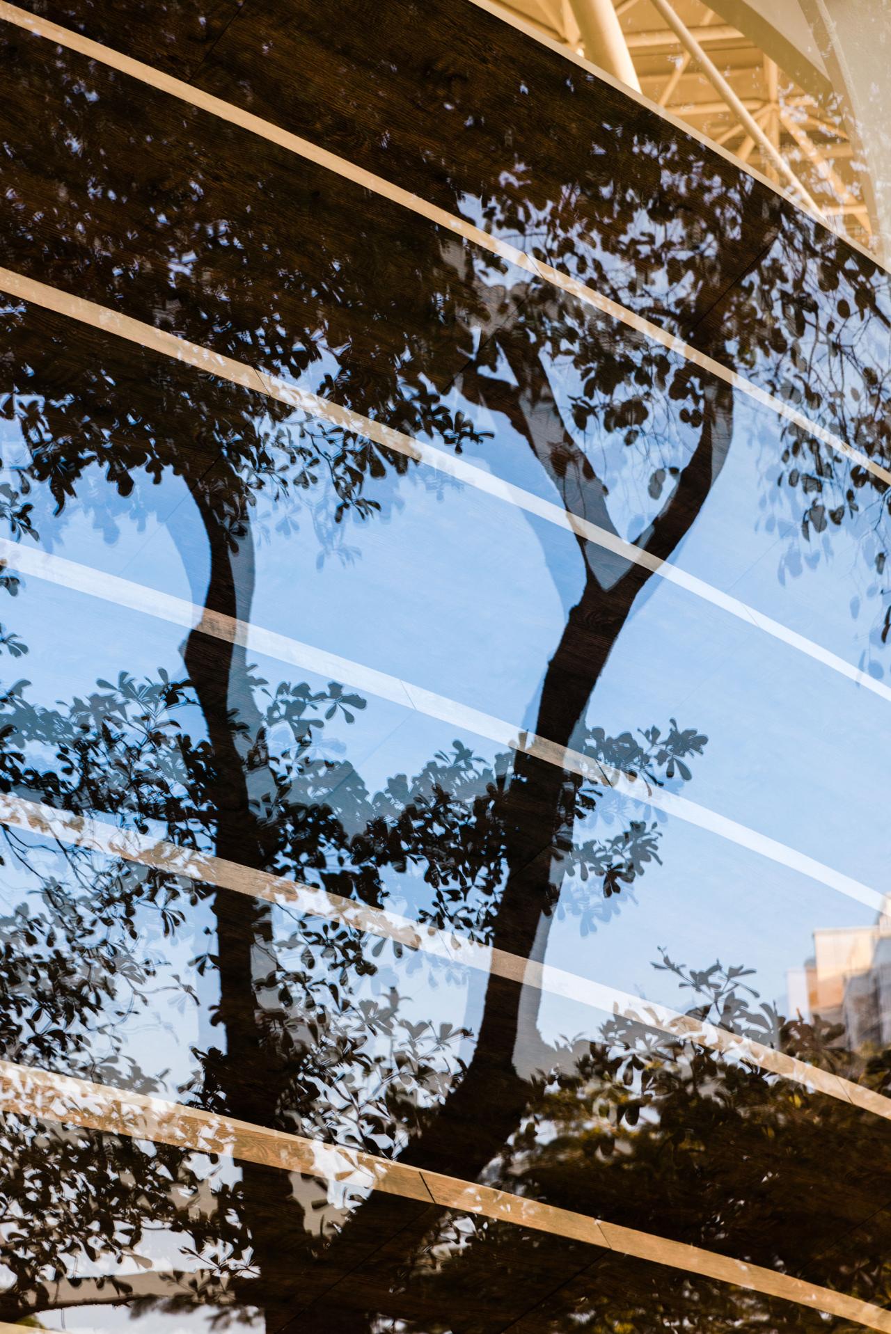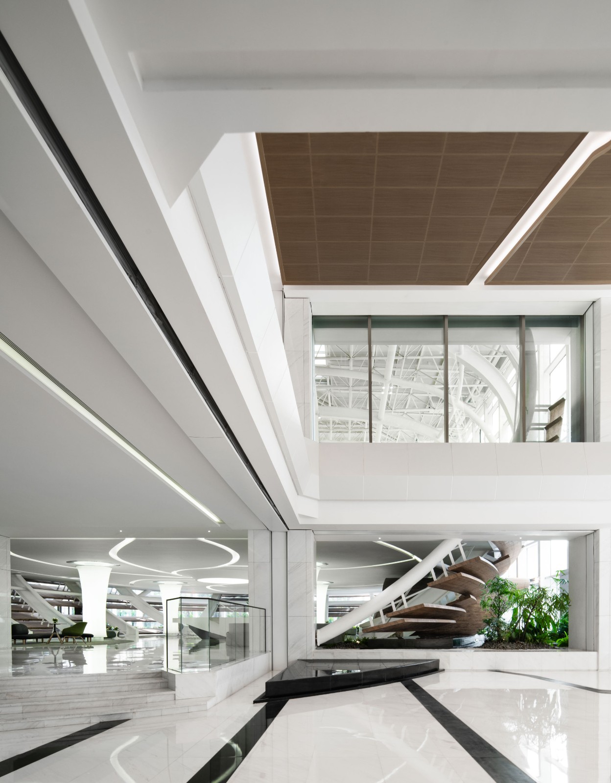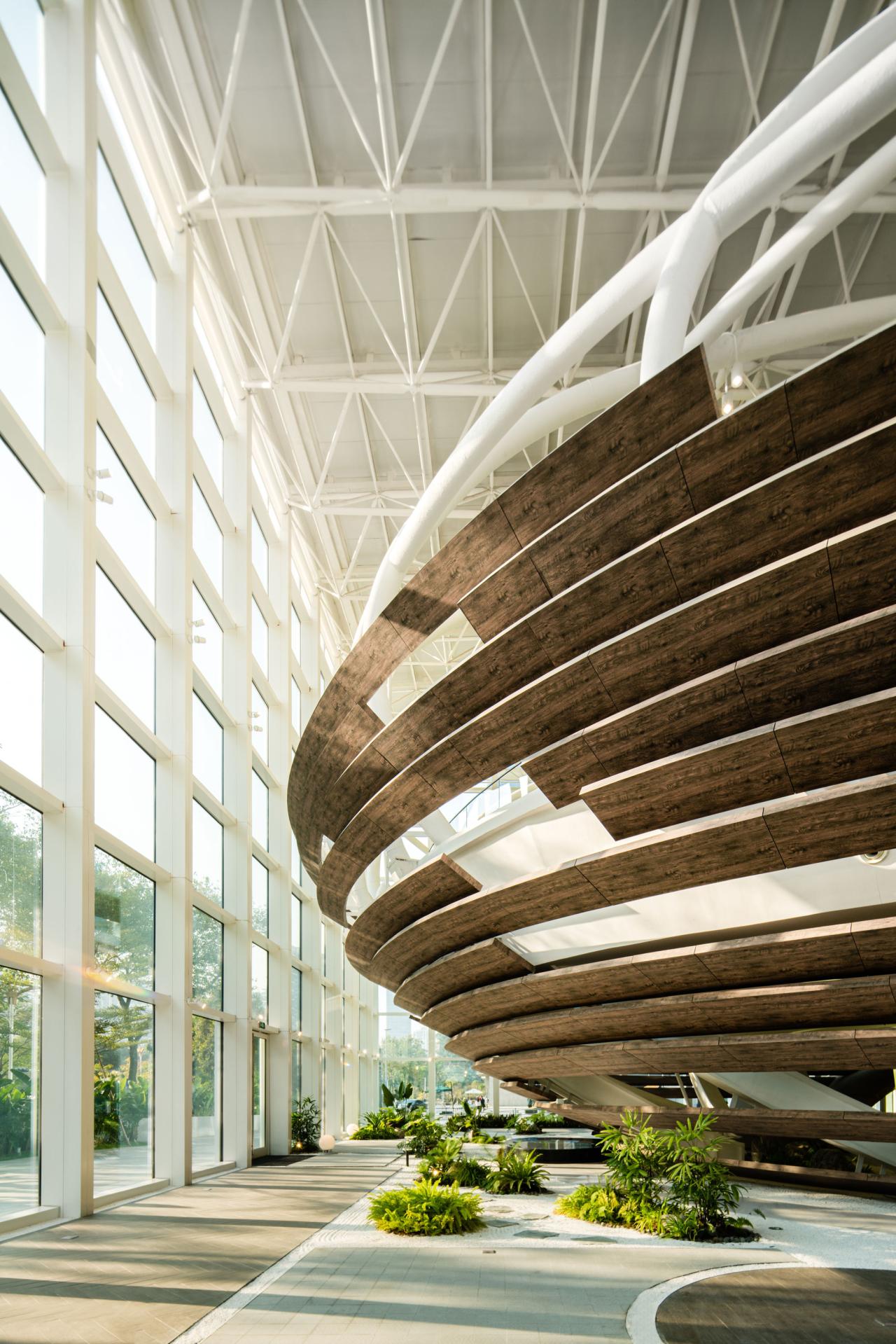 室内的绿意更添空间灵动,层层日光洒下,白色框架蜿蜒流动,颇有“虽由人作,宛自天开”的意味。“内庭园林”中不乏感性的文化气息,绿植在禅意的白沙上投下阴影,时间缓缓而逝。