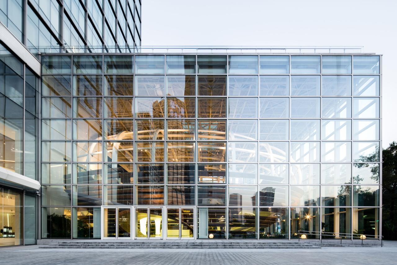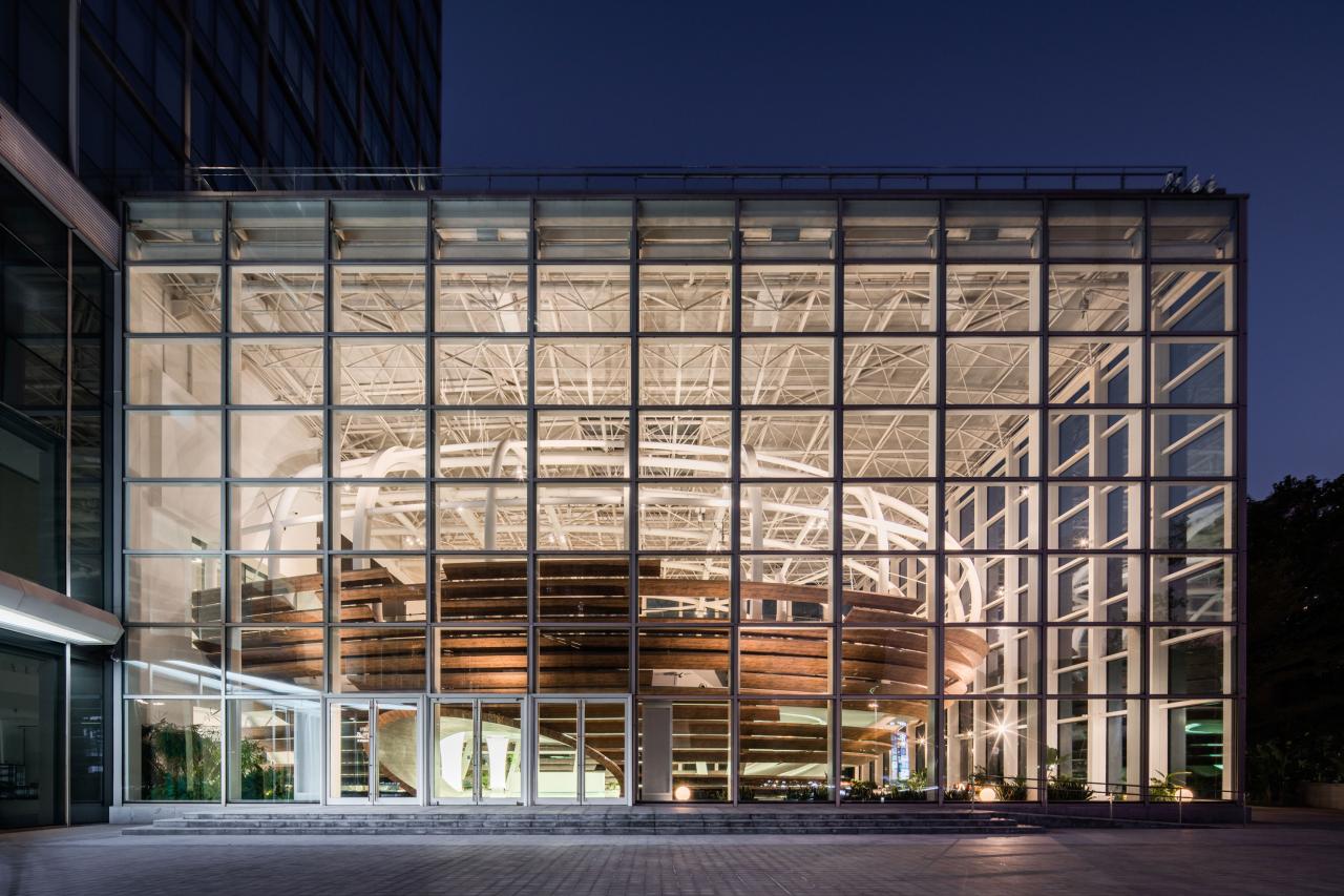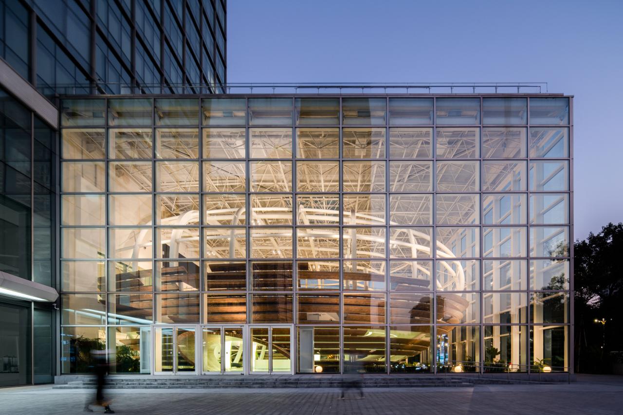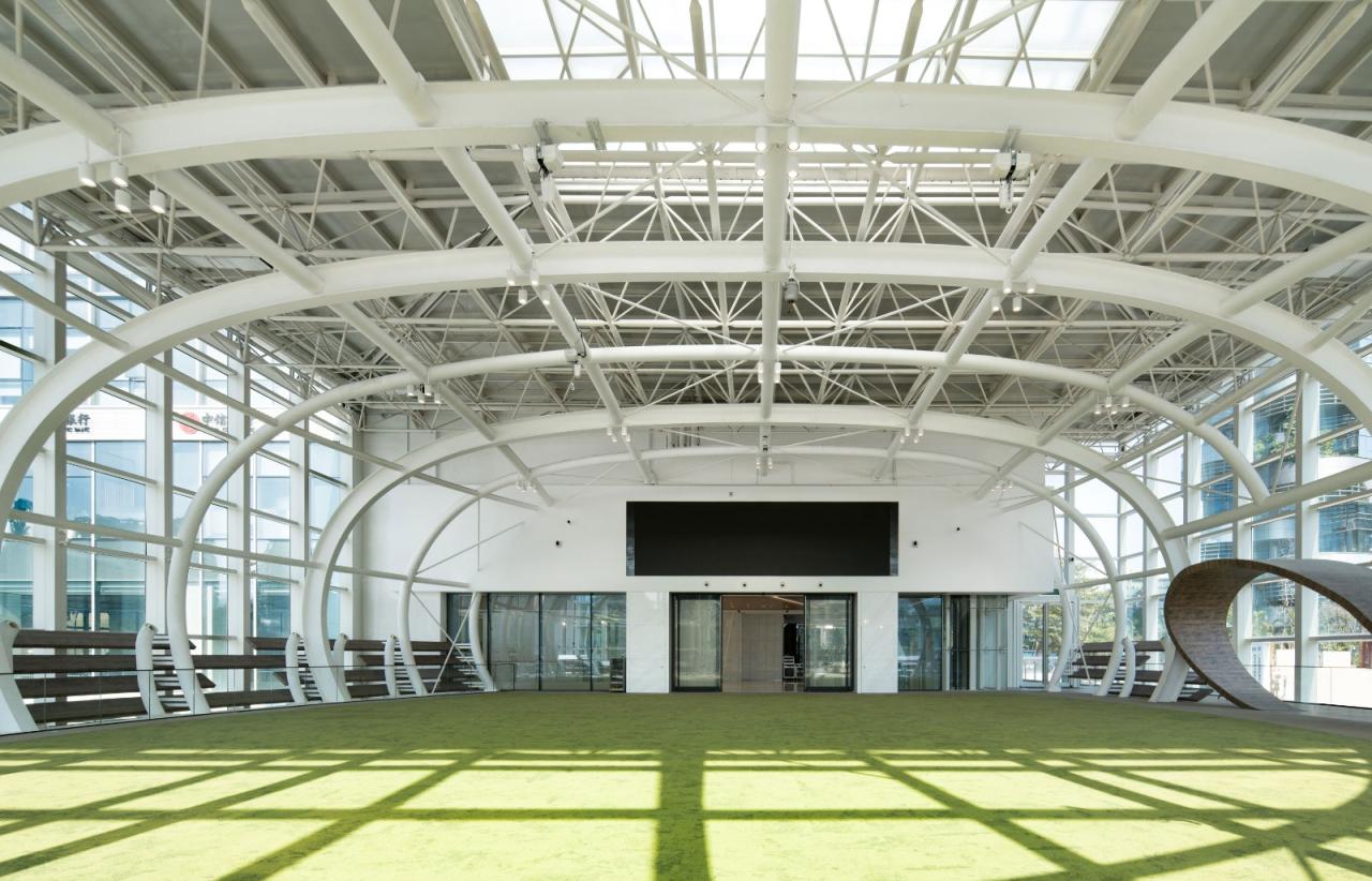 椭圆体玻璃建筑,我们常称它为“一个破茧而出的蛋”,与侨城坊之间形成一种独立而连结的关系,在开放、创新、自由、非常态的基调下,创造独具思想性的空间。同时,“蛋”的造型也与空间的功能使用不谋而合,艺术中心作为集企业发布会、路演展示、酒会交流等多元空间,旨在为企业发声的同时,成为企业真正的孵化器。