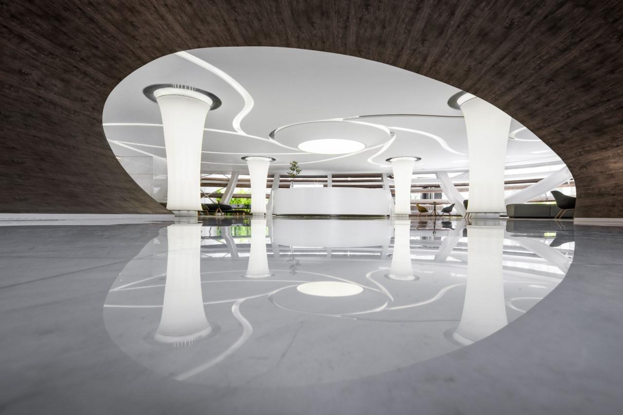 建筑设计师高迪曾经说过:“直线属于人类,而曲线归于上帝。” 曲线之美,与大自然最为相似,无可比拟。空间皆以曲线贯穿,每一条线都被赋予最大程度的张力,接待台作为下层空间的中心,以圆柱体造型聚焦视线,而分散在它周围的支柱系统,则被设计师作为发光薄膜灯具,顶部内嵌丝带形日光灯槽,穿插在柱子之间,勾勒灵动曲线。