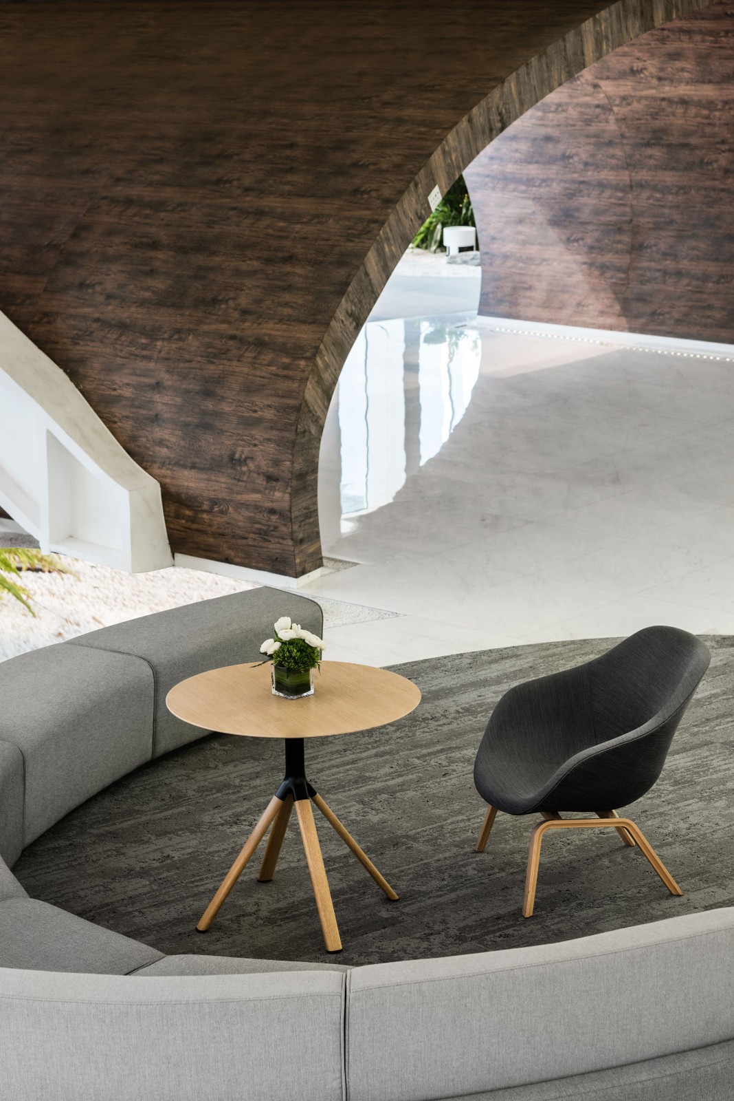 主会场位于上层,楼下是商务洽谈或是休闲的区域,吧台曲径通幽,缓步向上,愈发开阔,宁静而辽远,搭以西班牙老船木与苔藓植物相接,不失为都市里的花园谧境。 灵动的曲线运用于椭圆面中呈现几何之美,接待台、咖啡厅、活动空间的运用将实用主义融入建筑艺术之中,木百叶与外部庭院形成连通,引入和煦的自然光线。