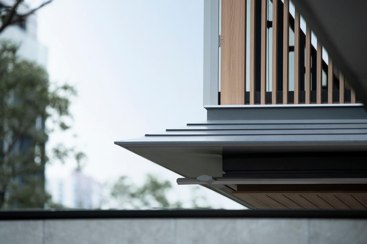 上界面木色吊顶,外沿设置600mm金属披檐及纤细的金属杆件。这一抽象于檐柱与额枋的古典构成逻辑,既能遮挡雨水,又为多层建筑阳台赋予了独特形式。