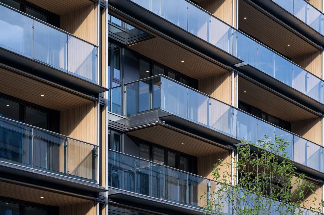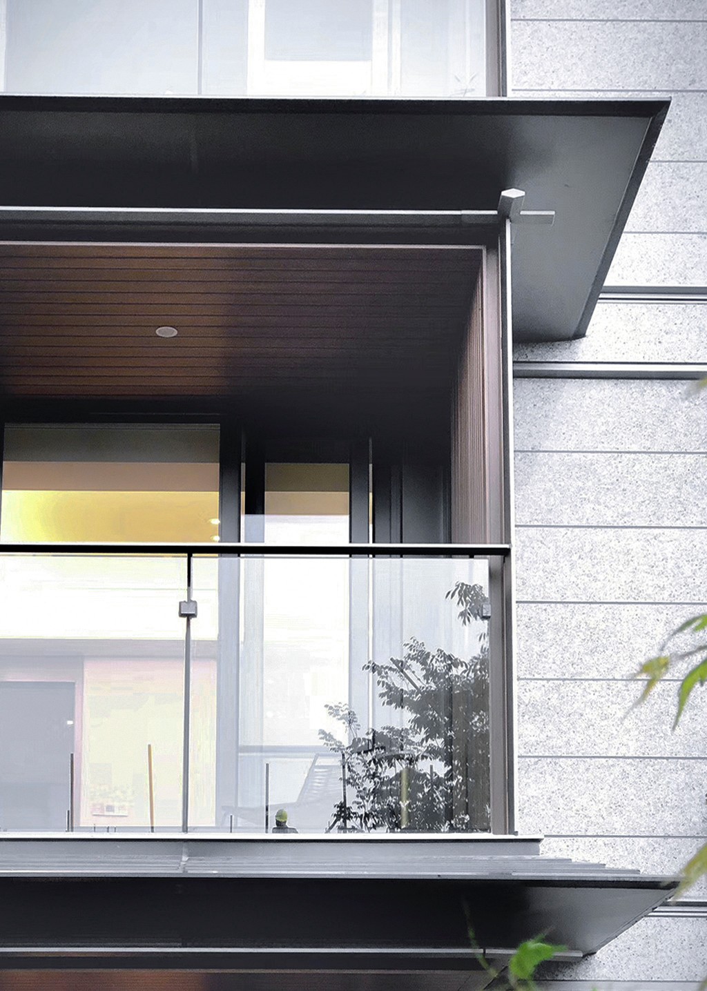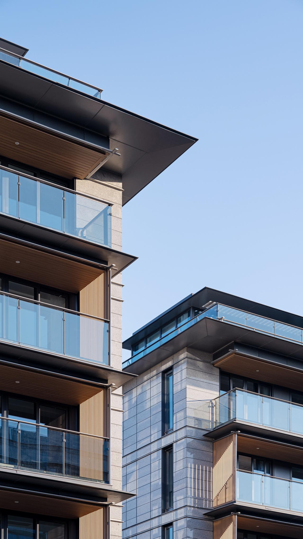 每个复式单元的两层阳台,在立面上置于同一个相对私密的空间内。灰色铝制线条纤细、清晰,为水平结构线增添视觉层次。建筑外墙材料采用浅色石材结合灰色铝型材,辅以暖色的木纹转印铝型材,细节丰富而和谐。