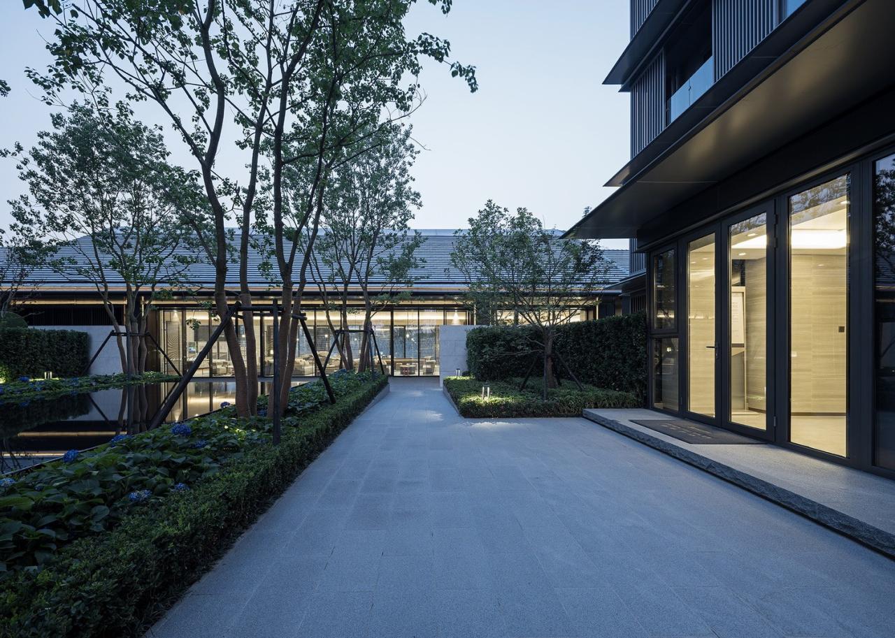 湖境云庐的公共景观系统以现代风格为特色,通过一系列院落串联多层住宅组团,并借助基地西、南两侧的水系和沿河步道创造丰富差异性,形成收放有致的社区空间。