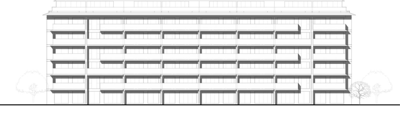 立面结构同时为设备问题提供了策略:阳台界面框之间的缝隙被巧妙地用于放置立面水管,使后者隐藏,立面呈现更加纯粹。