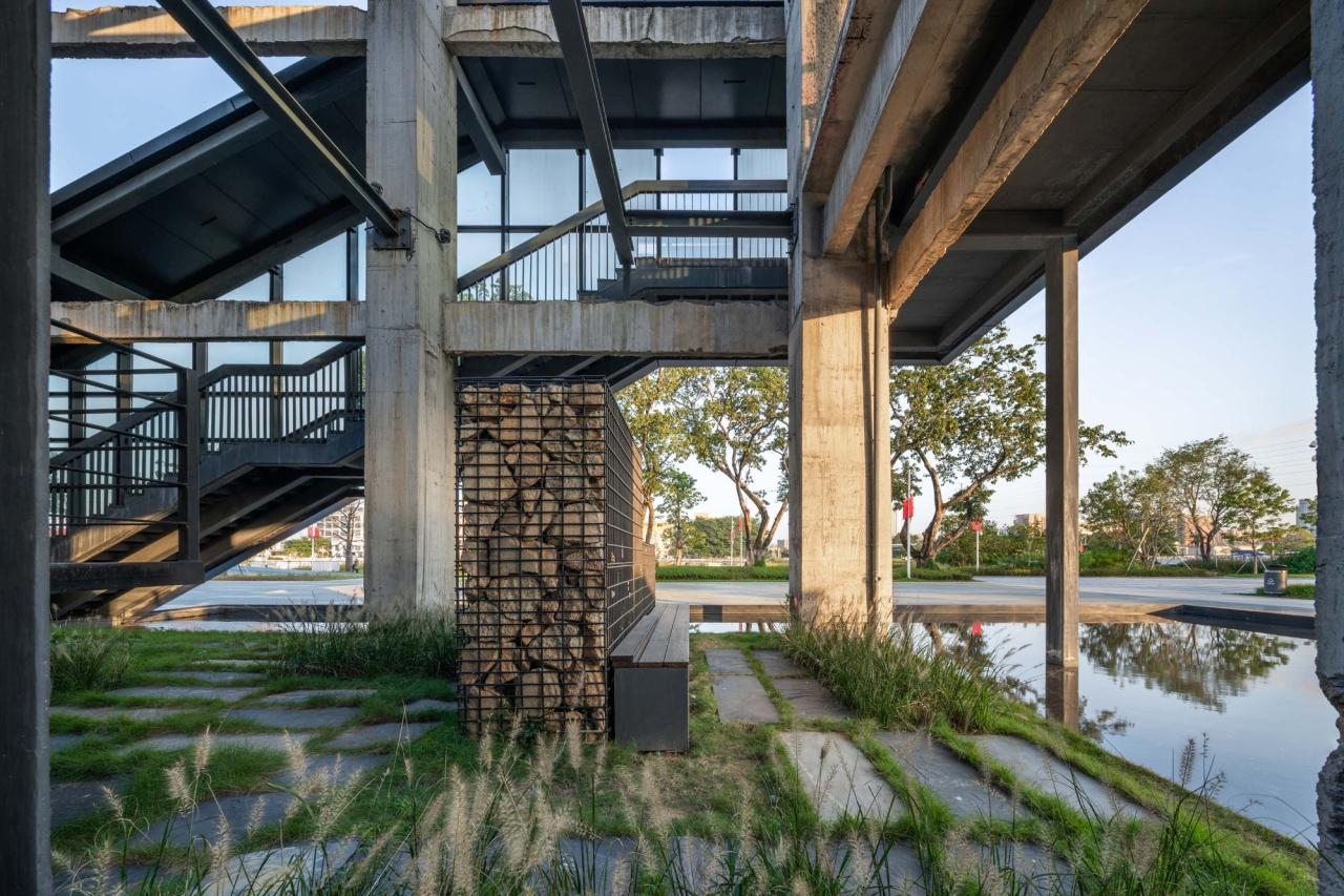 适应本地气候深圳地处亚热带气候区,常年高温、潮湿多雨,为了改善沙井村民大厅的局部微气候,调节气温,也为村民和市民提供室外的亲水、戏水之地,建筑师设计了一组景观水池,环绕于建筑周边。水池中的倒影,柔化了废墟的沉重感,也让整个建筑变得轻松和令人愉悦。