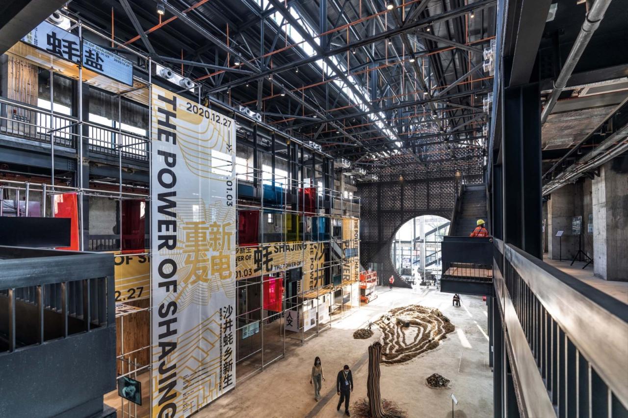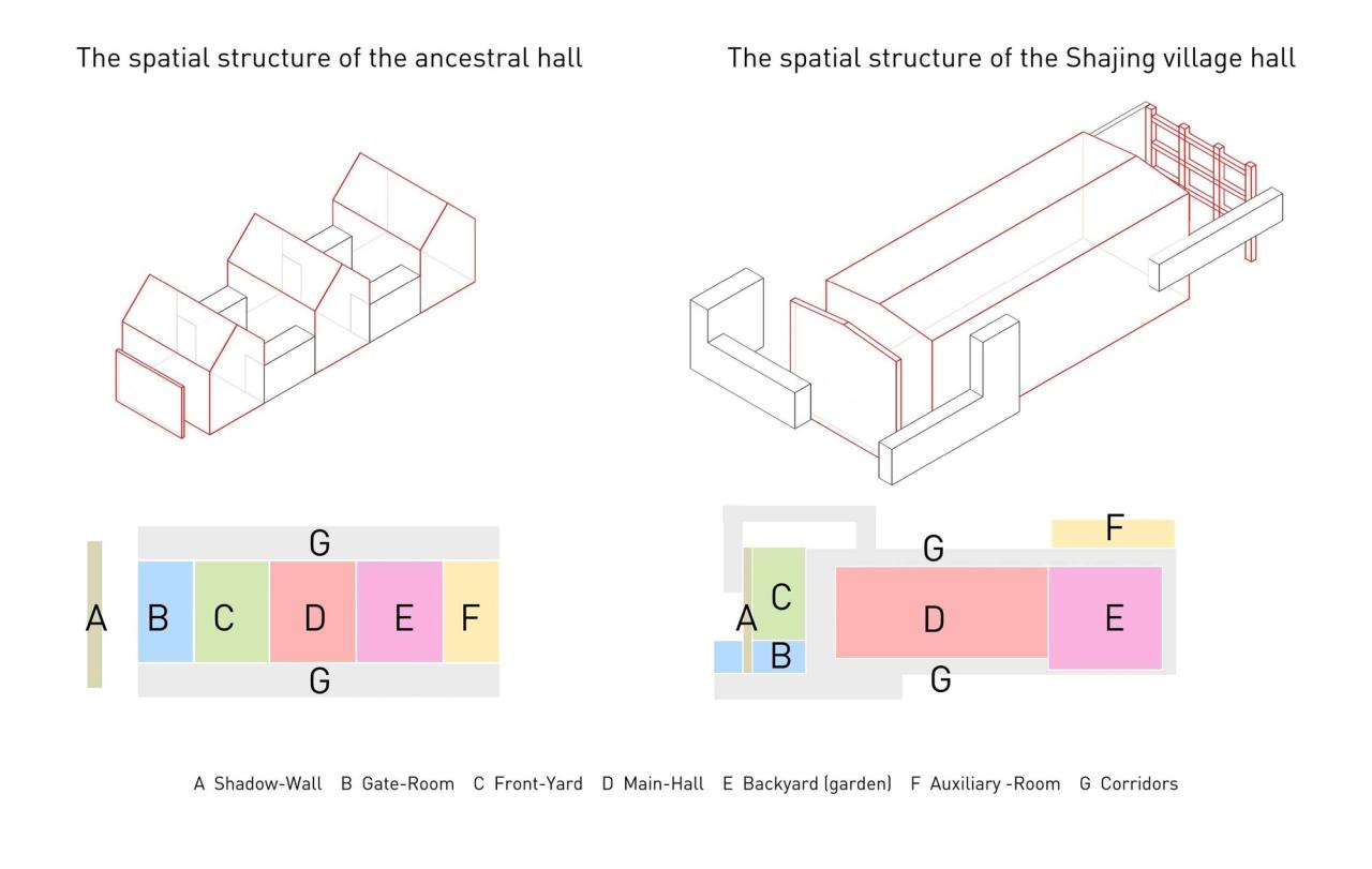 沙井村民大厅的主要设计构思,就是基于可持续设计的理念和方法,吸收在地空间文化特征,通过抽象化的转换,把旧工厂转变为新祠堂——即具有更广泛市民性的新公共空间。典型的广东地区传统祠堂,一般包含了七种空间要素单元:影壁、门楼、前院、正厅、后院(花园)、房舍、廊庑,这些空间要素单元在平面上大致遵循从前向后的序列分布,廊庑环绕周边。我们试图将上述传统祠堂的空间结构,运用到到电厂废墟改造设计之中,由于电厂的尺度较大,不能简单套用祠堂的形式,而是需要在三维空间上进行巧妙的衍化与变形。最终,沙井村民大厅呈现出来的是一种介于祠堂和工厂之间的中间状态。