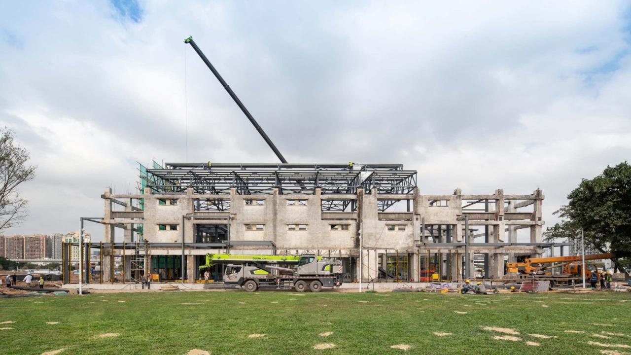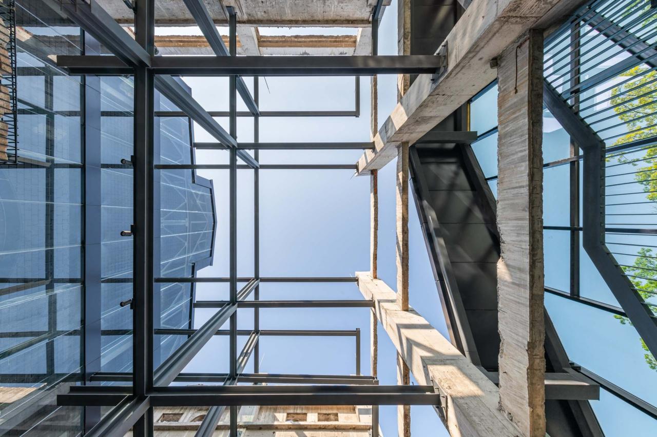 在结构检测和安全评估基础上,对原有废墟结构进行了分类处理,采用了多种多样的结构加固和再利用技术。在确保结构安全基础上,尽量发挥原有废墟体的结构和构造作用,但新增的钢结构主体,还是与原有混凝土梁柱结构脱离开来。这种新和旧之间“若即若离”的状态,增加了施工难度,整个施工过程是非标准化的。