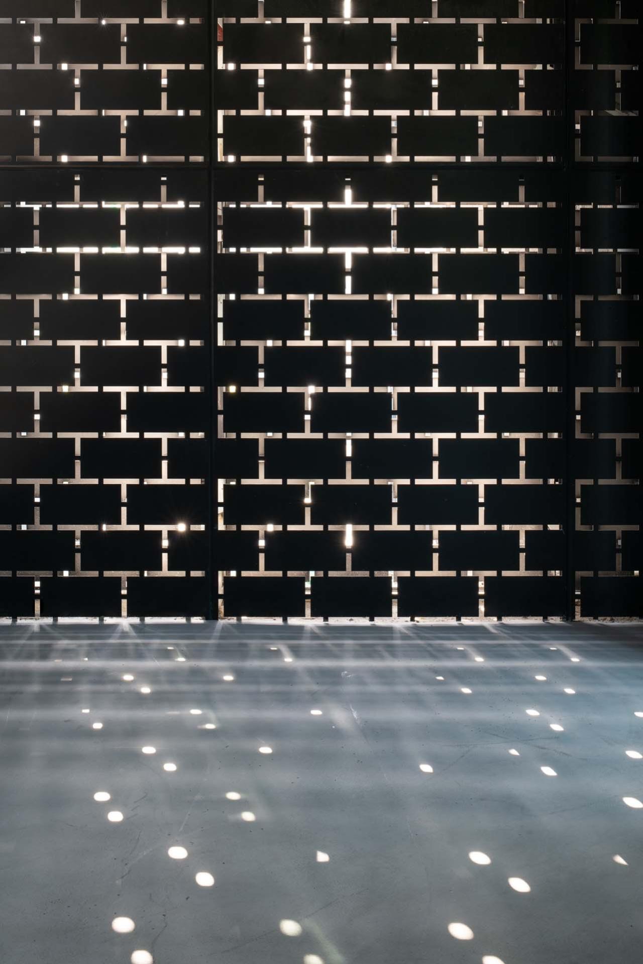 有历史感的穿孔铝板砖墙建筑的东西两侧山墙已经被拆除,建筑师希望通过某种方式恢复山墙的原始意向。我们与沙井村一家金属加工厂合作,用激光切割出砖墙的纹理,定制了黑色穿孔铝板模块(每块的标准尺寸是1800×1200 CM,局部有变化),它们拼装在一起,形成了巨大的“透光影壁”。当斑驳光线穿过时,就产生了通往精神世界的动人效果,同时也让人回忆起旧砖墙的过往痕迹。