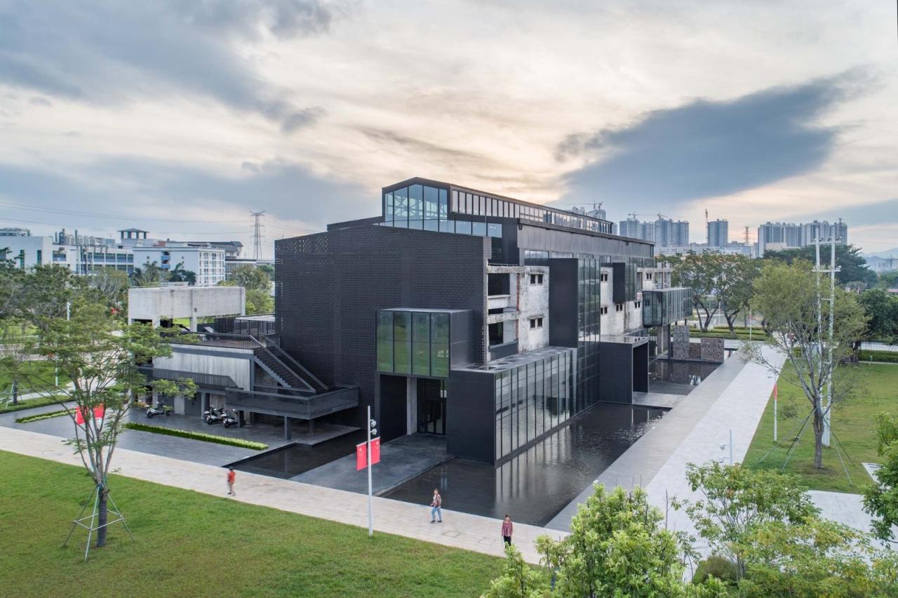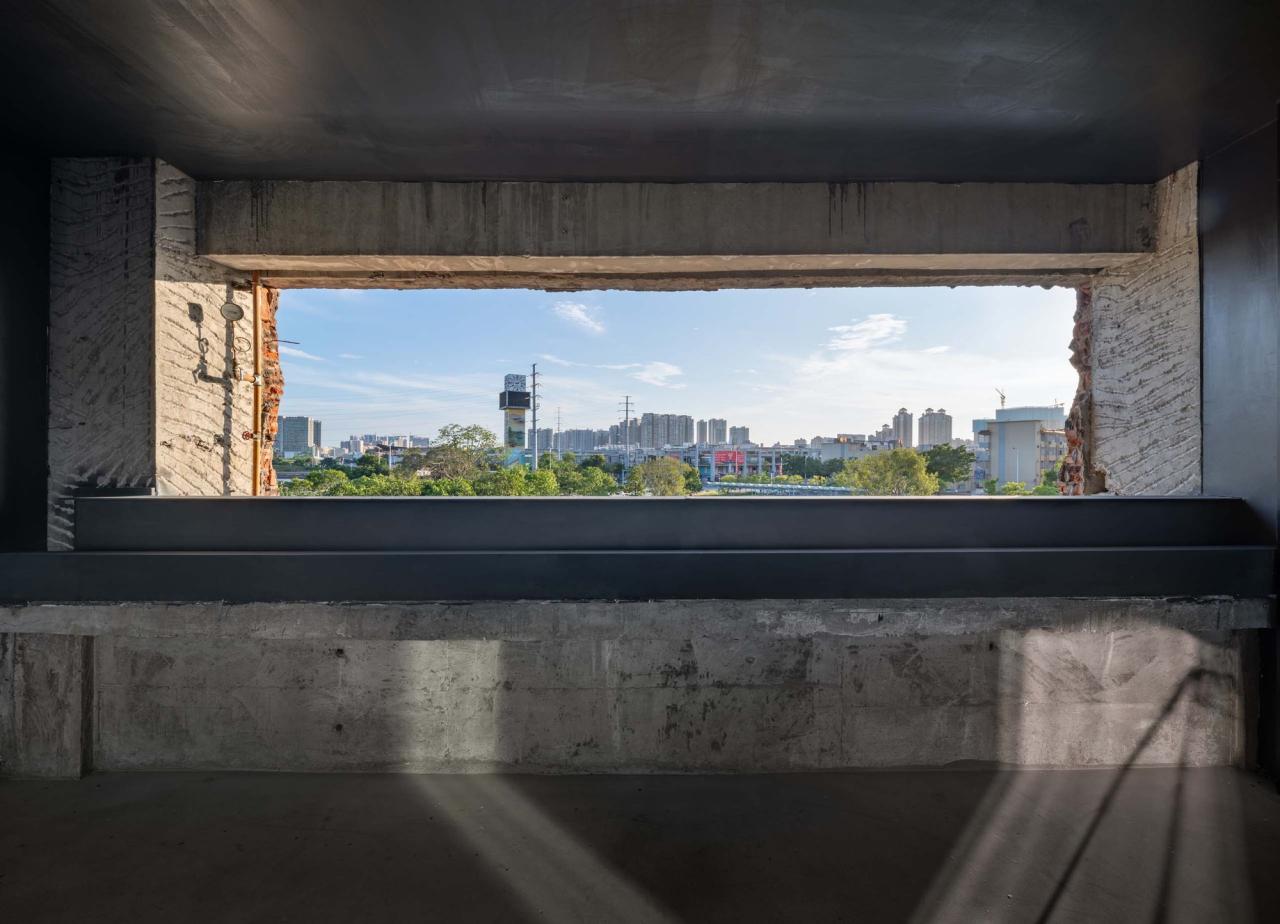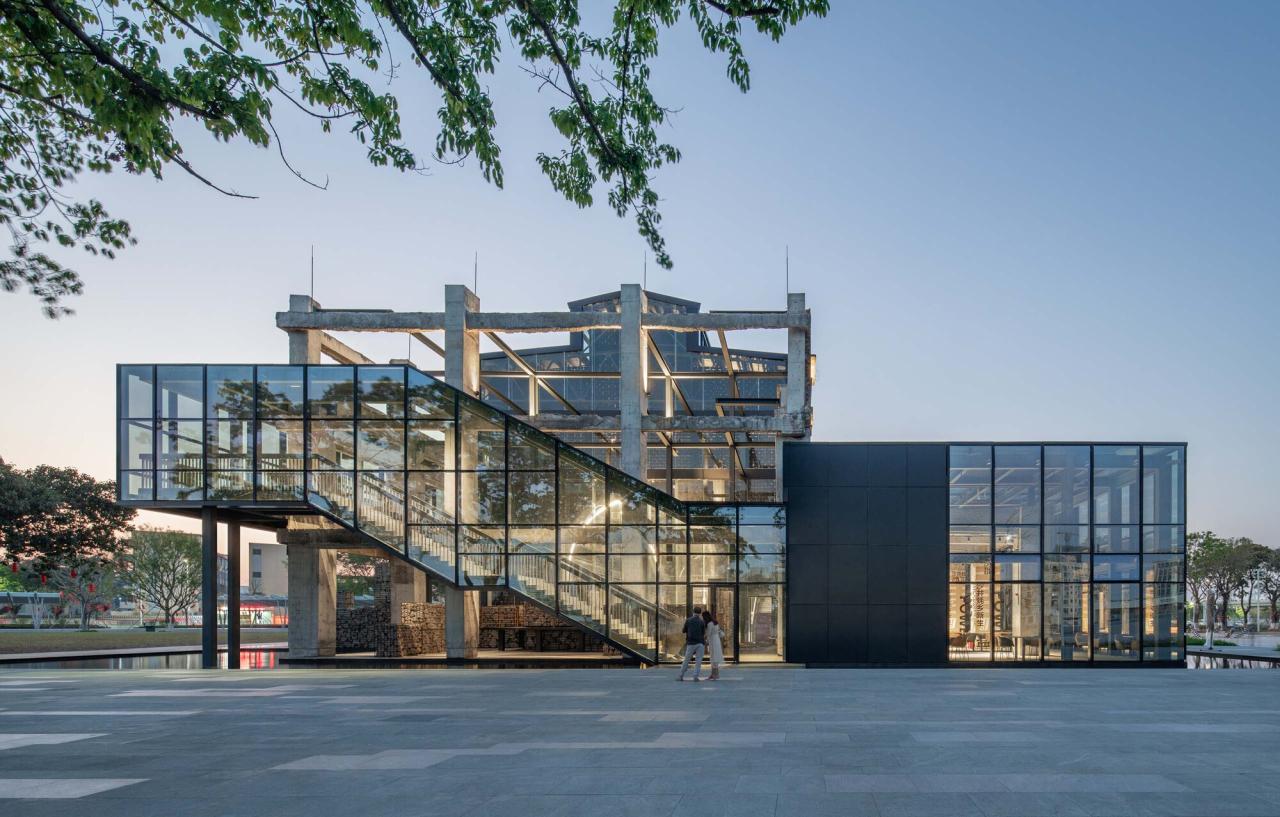 墟园,尝试运用抽象化的叠山理水方法,来表达与中国古典园林相类似的空间意境。诸多观看和被观看的视角被创造出来,构造出一组独特景观——对景:透过玻璃月洞门,在大厅和墟园中可以相互观看对方;框景:工字钢穿斗梁意外地把天空框入其中,形成奇妙的仰视景观;借景:远处蚝乡湖的波光树影被借到墟园之中;引景:曲折的楼梯与廊道,从视觉和身体上不断引导人们去探索未知风景……