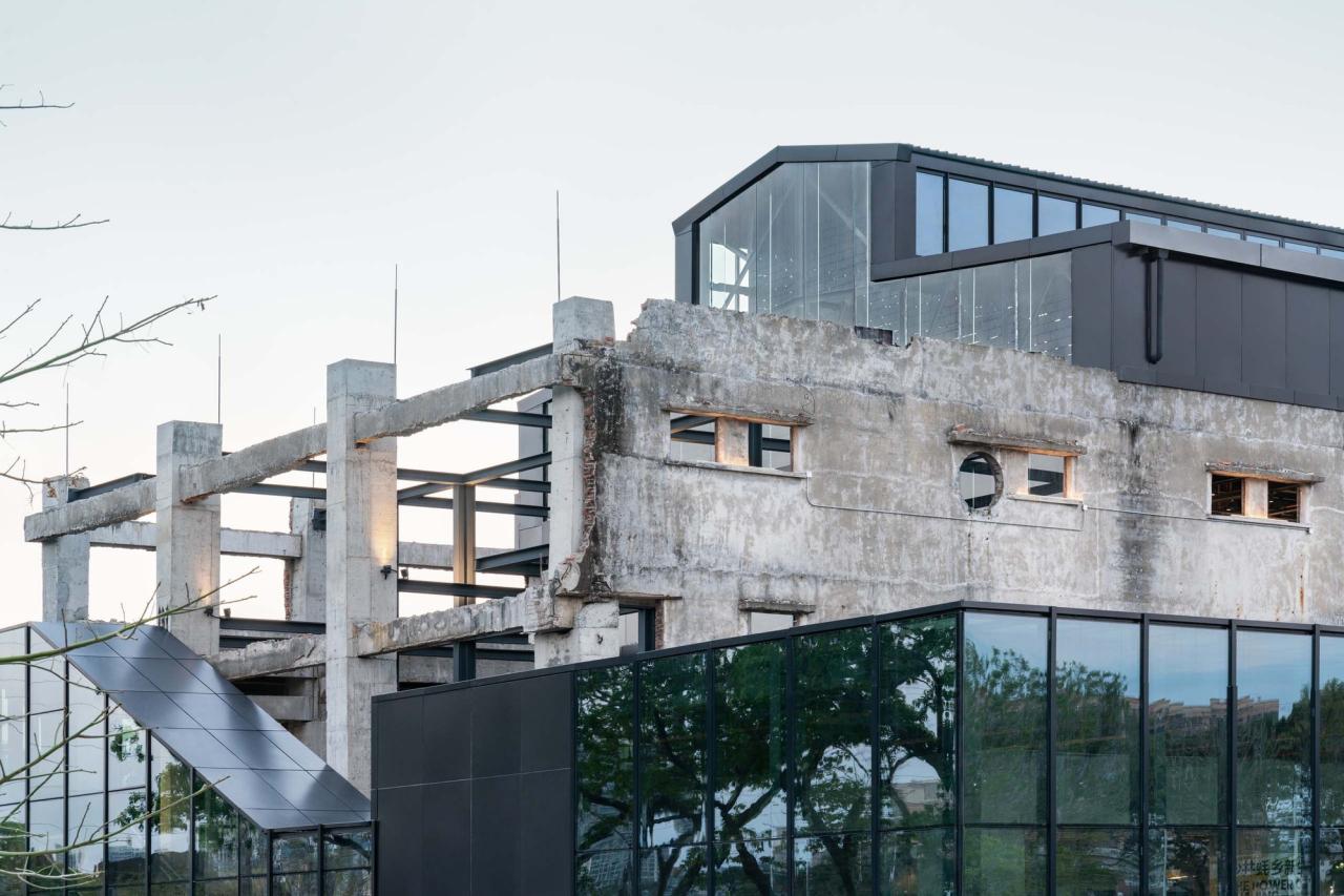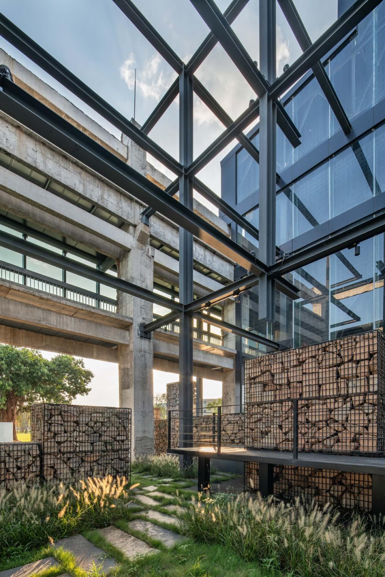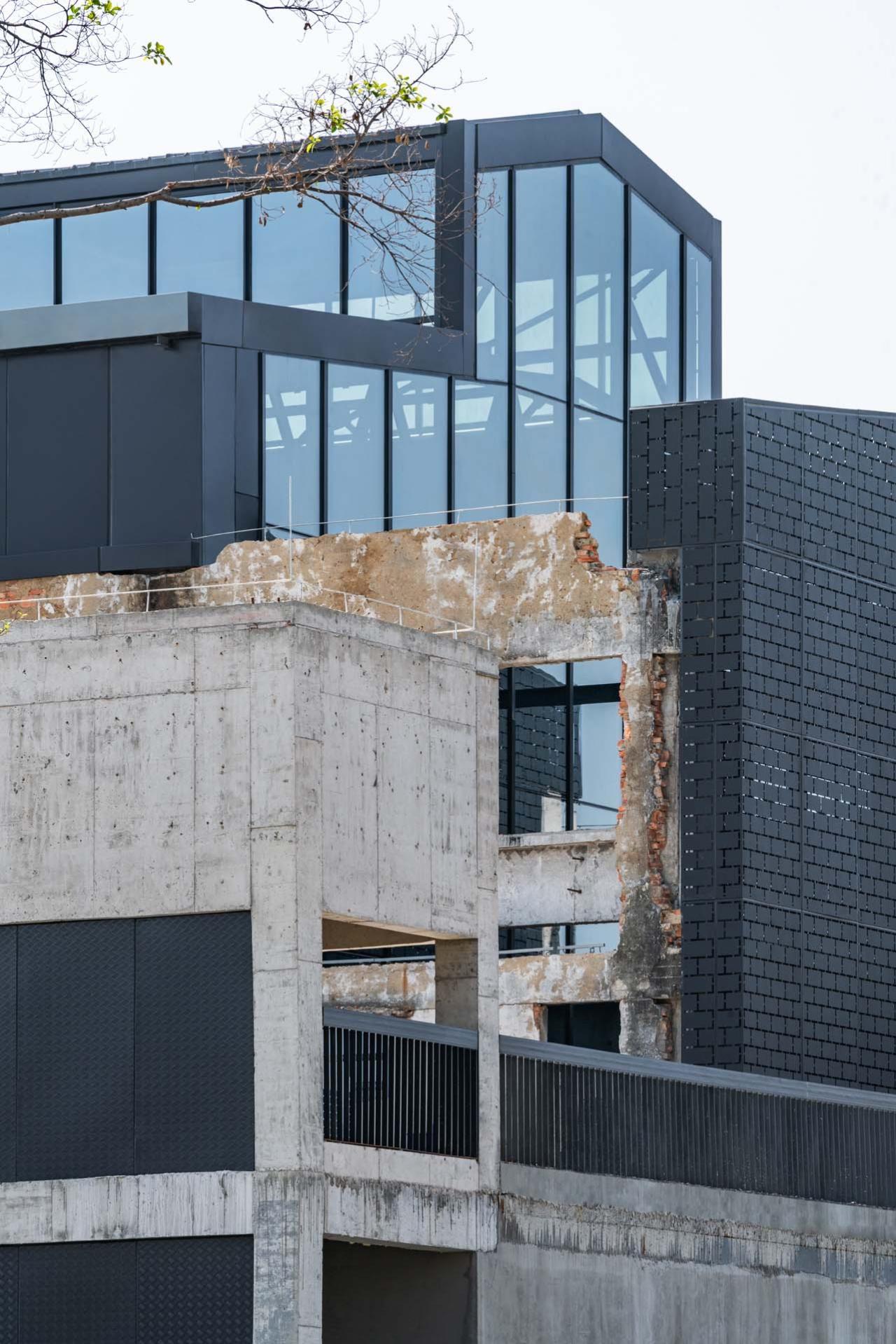 废墟的物质性再生——旧的废墟实体、结构和细微痕迹得到最大程度保留,废墟的混凝土结构经过加固后全部被循环利用;另一方面,新的钢结构和玻璃等材料和体块,或插入、或包裹着旧废墟,它们相互编织、交融在一起,含混了新与旧的绝对界限,使得整个建筑成为连续生长的有机体,犹如老树发新芽,“新”从“旧”中自然萌发、自然生长出来。