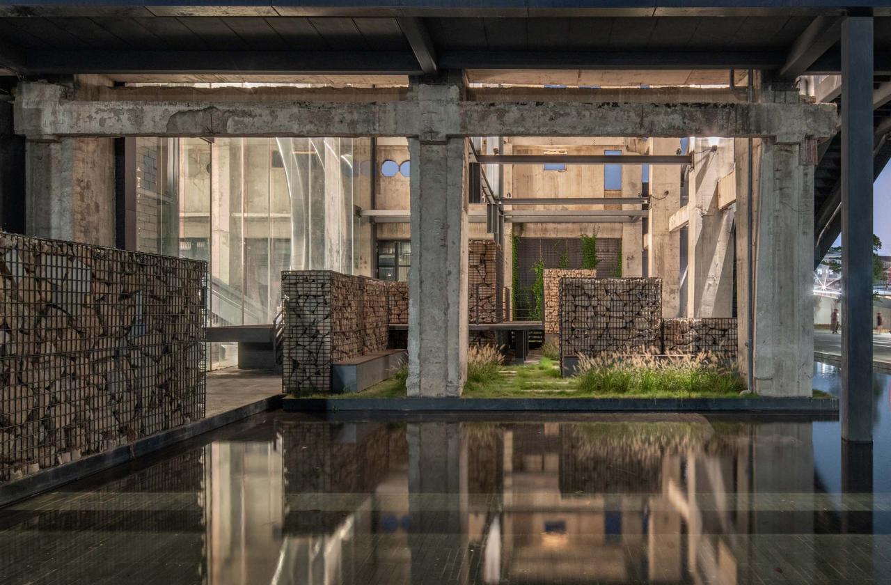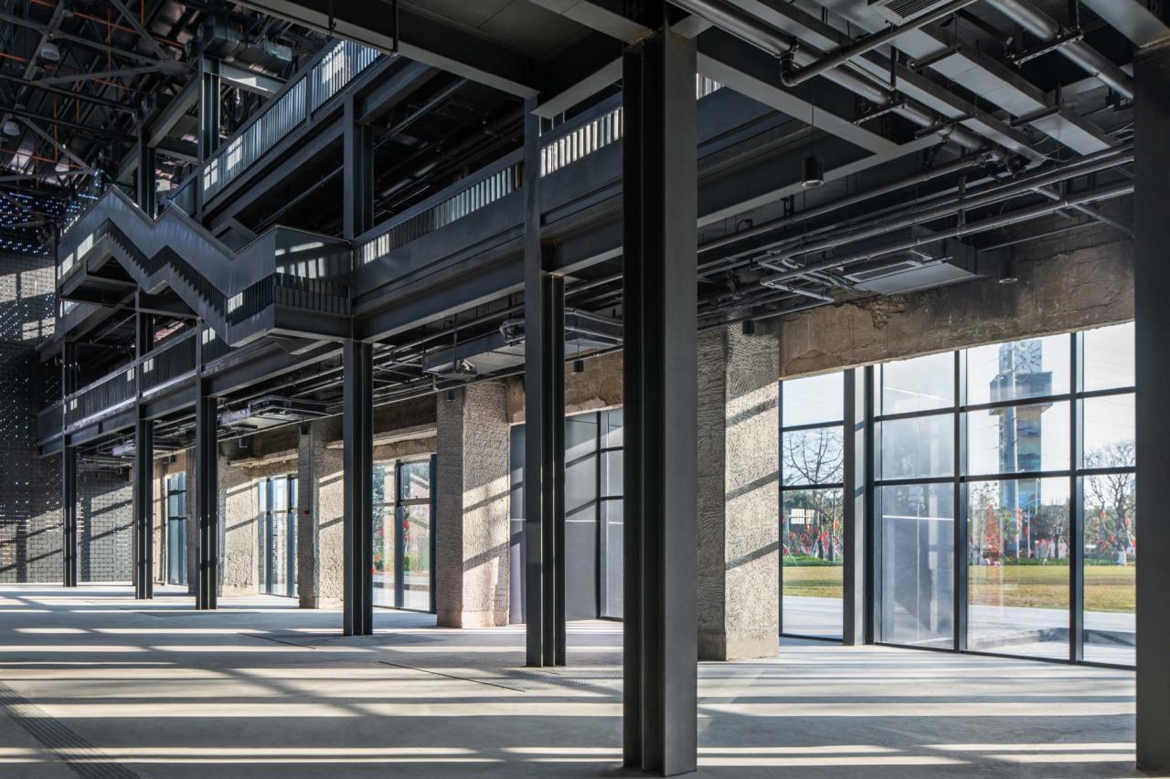 废墟中的庭院-墟园在先前的拆除行动中,电厂的东西两侧山墙和屋顶局部已经被拆除了,建筑师顺势而为,增加了前院和后院。前院名为“光影庭园”,是占据了一个柱跨空间的狭窄庭园,正午时分,当斑驳光影撒进院落,或许能引发人的怀古幽情;后院名为“废墟花园-墟园”,四边保留了部分废墟墙体和废墟梁架,围合成一个可以进入游览的有趣花园。由于结构需要,为了平衡大厅屋顶钢桁架的侧推力,同时也增强结构稳定性,一组由工字钢构成的梁架系统被设置在废墟花园上空,非常类似中国传统木构建筑中的穿斗梁。建筑师与结构工程师合作,使单纯结构系统呈现出文化意义。