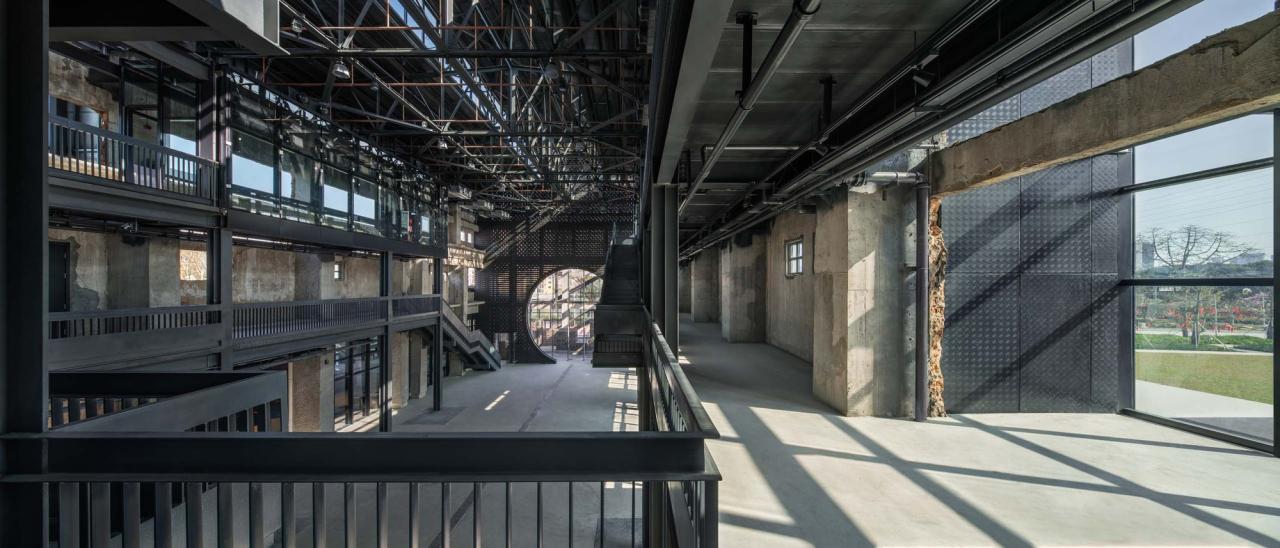 废墟构架的保留,不仅涉及结构部分,还包括一些坚固的构造物。比如,大厅上空南北两侧的混凝土吊车梁被保留下来,吊车梁以及墙体上遗存的方形窗洞和圆孔(用于安装电厂通风管道之用)成为整个“墟构”的一部分,它们叙述了一段历史,也为空间增加了意外的随意感和神秘性。
