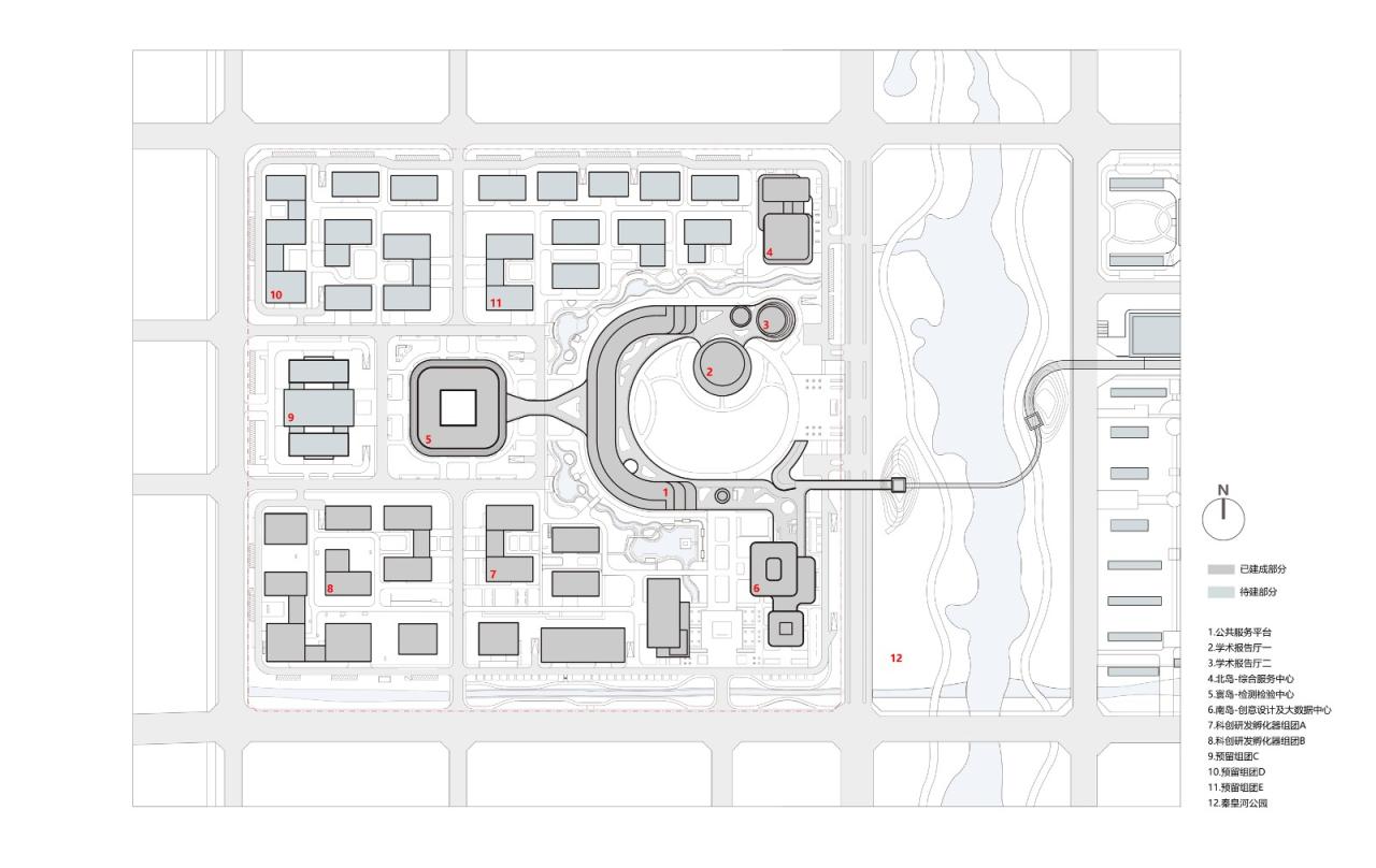 “共生”是创新园区来自内部功能和外部城市的共同诉求,有序自然的空间格局与高效复合的科研活动相互编织,将建立一个激发创新的空间体系。每天往返穿梭于环境优美的秦皇河风景带,为创新研发人员高强度的工作提供心灵放空的间歇,是创新活力的源泉,也是城市发展的动力。项目各方在不到一年的极短工期下紧密配合,希望最终能建设一个有温度的园区,一个有归属感的家园。