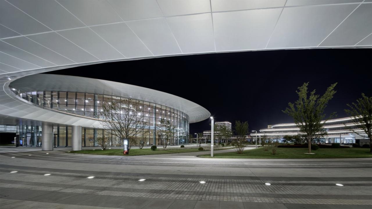 单体建筑造型遵从自身功能逻辑,各有不同。但总体上通过颜色、形式逻辑统一成两组建筑群落,整体协调。公共服务平台以层层叠叠的水平线条呼应水文化的特质;检验检测中心根据实验室对采光均好性的要求,结合水平向的穿孔铝板,最终呈现传统灯笼的造型意向;办公研发组团立面则在常规单元格的基础上加入一个斜切面,打破产业建筑冰冷、呆板的形态范式,为理性的工业美学寻找一丝浪漫与温情。