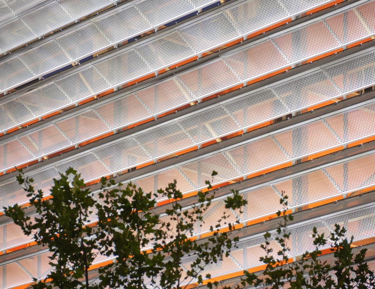 检验检测中心大楼其外立面由折边的穿孔板构成,为了尽可能减少立面分缝对于观感的影响,外立面选取了平面尺寸较大的非常规穿孔板块。连接穿孔板的次龙骨采用三角桁架,减小构件尺寸的同时,支撑构件的结构形式与外立面的三角折边穿孔板相呼应,达到建筑形式和结构形式统一的空间效果。