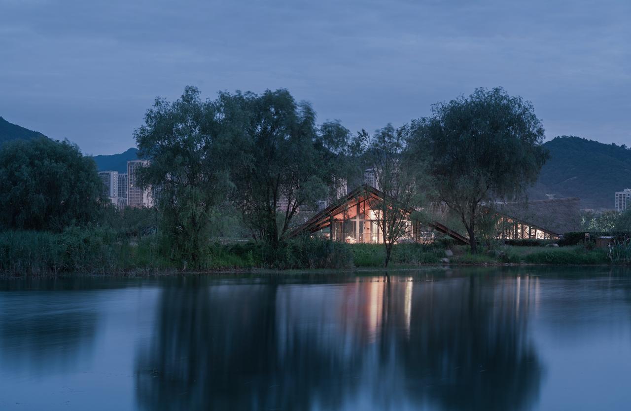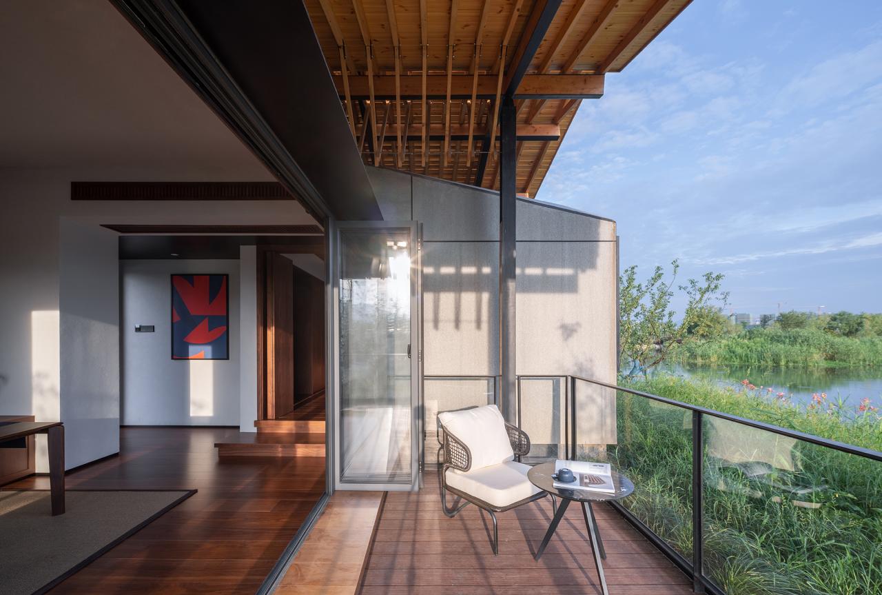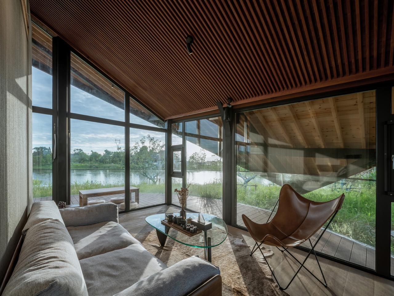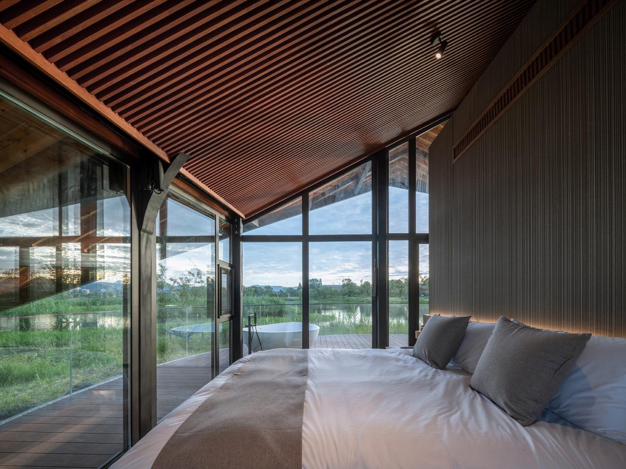 湿地生态酒店由两个客房类型有机打散分布组成,都是运用了在大屋顶下生活的概念,大屋顶也像是翅膀,如小鸟般栖居于此,在岛上停留片刻,轻轻落在水面上。古人造物很喜欢因地制宜,轻巧的介入自然,用木头把房子架在水上,房子被自然融入与包裹,这种生态观念在中国人的骨子里就一直存在。很多人会说这两个房子很有江南的味道,我认为这种江南性一方面在于对房子虚体空间属性的理解,放大檐下空间的比例,连接人居空间与自然天地,同时通过对尺度的把握创造怡人的居住空间,皆是营造一种人、空间、自然三者之间的关系。