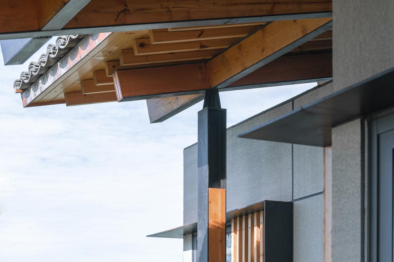 在建造方式上,大部分构件还是厂家预制好现场来组装拼接。结构的选择是钢结构为主,工厂预制现场组装和焊接,实木用在屋顶椽条梁部分,墙体则是用轻钢龙骨支撑和板材基层,外立面材料也是使用相对标准规格的板材和系统玻璃门窗,由工厂预制好现场拼装。基本实现全屋80%的预制化体系,施工配合好,就可以实现快速精准建造,减少现场环境的破坏和垃圾噪音。钢结构在两个房子中的运用方式不同,小户型中钢结构和空间立面屋顶系统结合,都是清晰的裸露出来,立面系统玻璃门窗填充在结构中间,形成一体的关系。而大户型则是将屋盖框架体系和室内盒子体量的结构完全分开,屋盖系统的结构全部裸露清晰可见,包括钢木连接构件,工字钢填充木头,木头构件之间的连接,还有底部架空的钢结构杆件,而盒子体量的内结构则是被包裹起来,让建筑的空间形成逻辑很清晰的表达,也让建筑的建构之美通过精小的建筑展现出来。