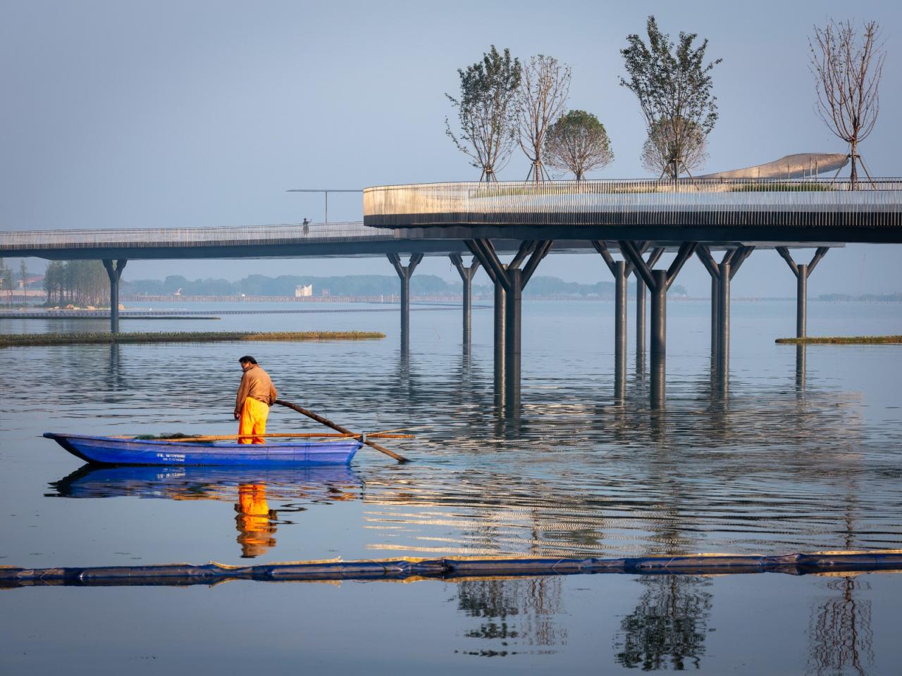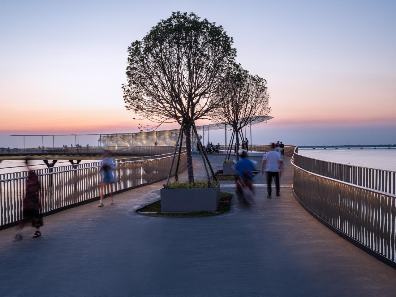 在行进的方向上,步行者和骑行者进入不同的线路,绿化带将两者间隔开来,这种线性设置为当地居民的健康生活划分安全边界。曲桥有三个加宽的部分,各条线路相合,并加入休闲长凳、观景平台、景观亭等,可供游人休憩及观赏湖景。这种线路设计延续了江南文化的动观为游,妙在步移景异,奇在风景如画。游赏相间,动静交替则元荡湖之景致尽入眼中。