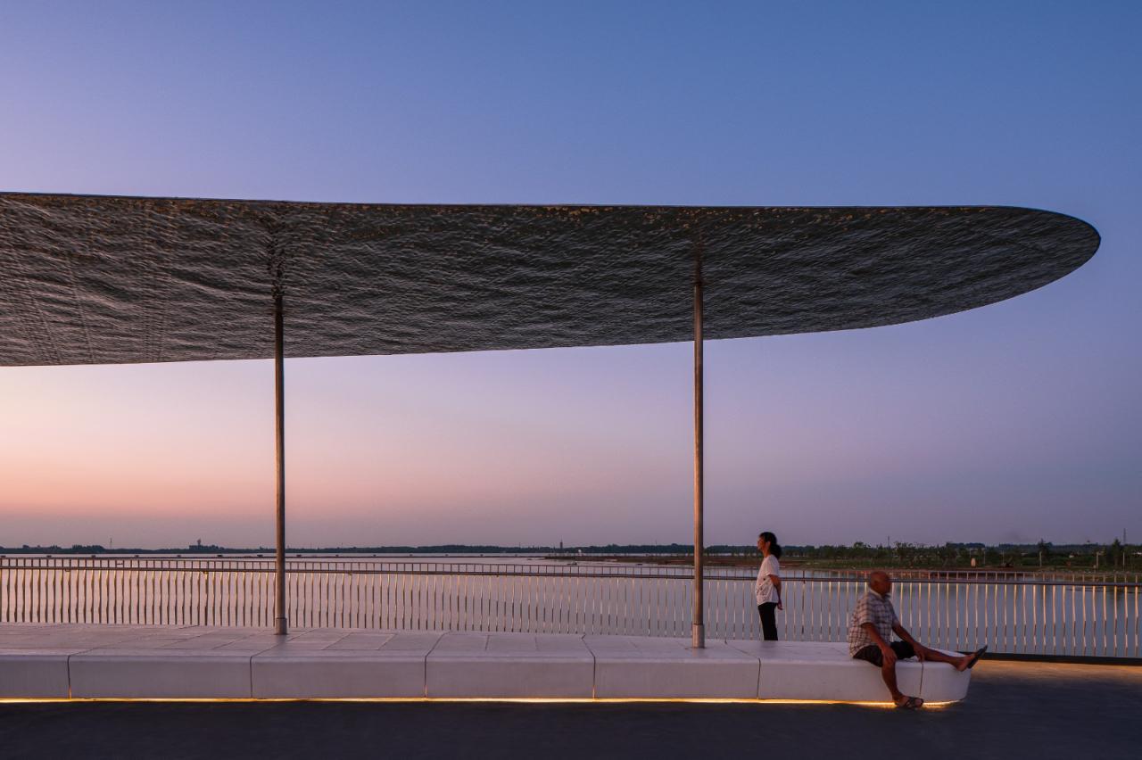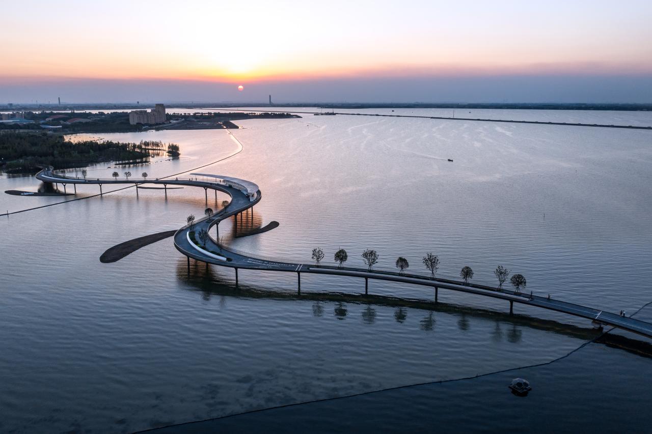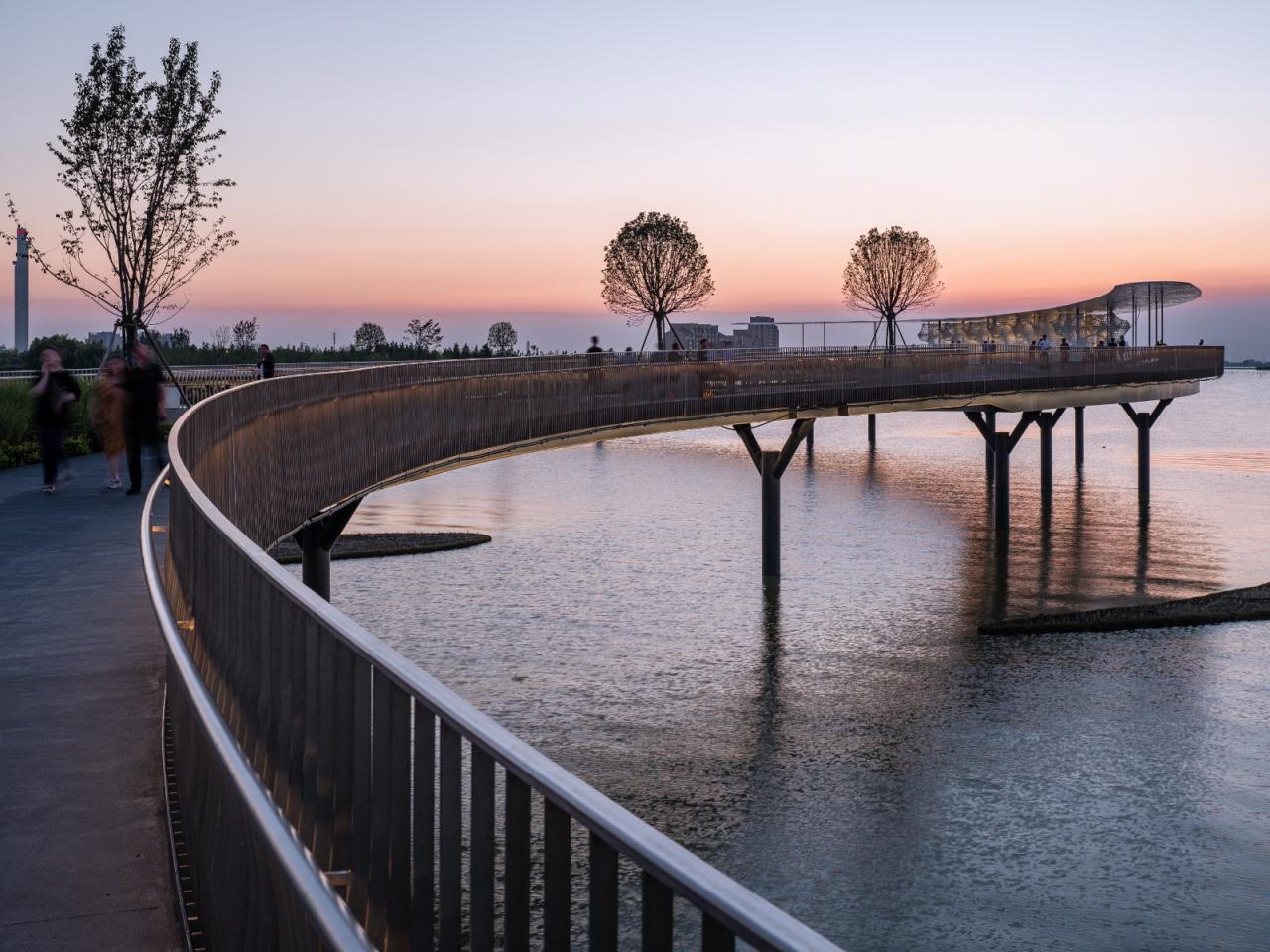 元荡桥全长586米,整体设计以“同心结”为理念,体现青吴两地同心共治的发展愿景。桥身如同一条缎带,连同揉入湖水柔波元素的桥上栏杆,与元荡湖上的水波交相呼应。景亭中的太湖石小品,灵感源自当地传统雕塑,设计上探索了当代数字建模及制作,创造了既是雕塑又是游乐场的多孔墙。