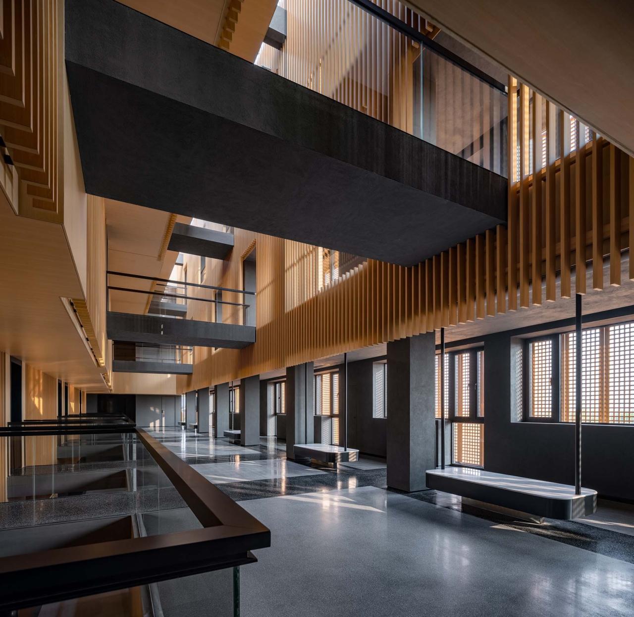 中庭北侧层层叠落的客房形成退台式的景观露台,在获取更佳的河流视野同时,为旅客提供了室外休憩的空间。可开启的铝木格栅屏幕包裹了中庭南侧临街的立面,在建立起室内与室外模糊联系的同时,也为中庭提供微妙的自然光以及舒适的微气候。