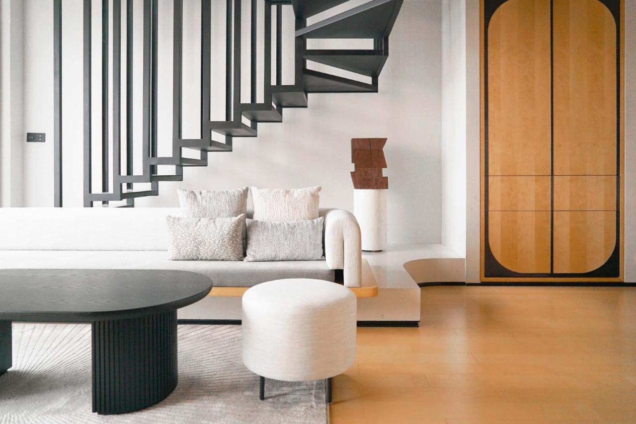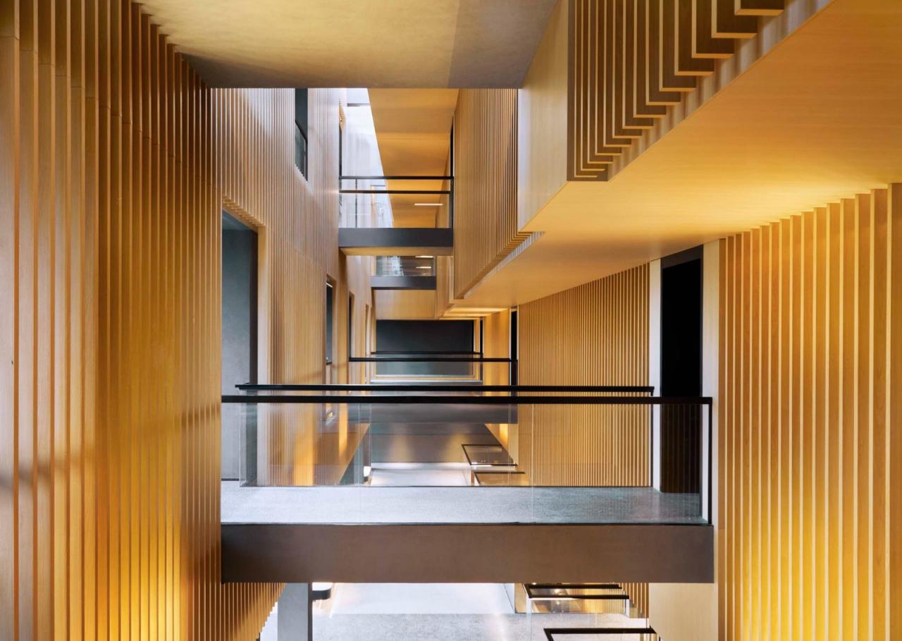 酒店的室内设计从当地的空间传统以及水乡宁静的环境获取灵感,自然的木材、工匠手工完成的抹灰、定制的水磨石墙面和地面,以及精心设计的艺术品,贯穿了酒店的室内空间。一个具有雕塑感的旋转楼梯将住客从酒店大堂引入中庭。