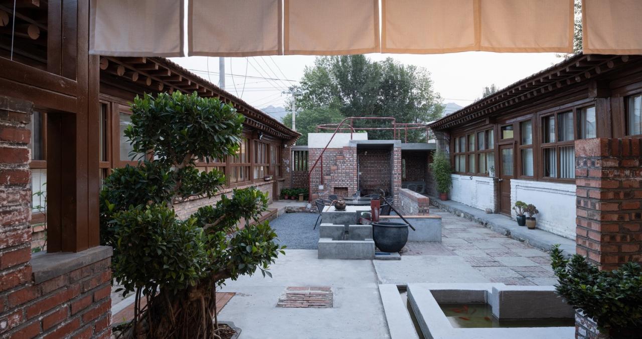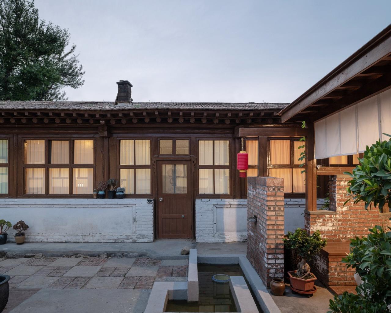 进入小院借原有水井将院落划分为东西两部分,西侧包括玄关和由玄关造型形成的专用烧烤区域以及户外就餐活动区。小院北侧在拆除原有临建房的基础上,在原位置重建砖木结构茶亭,茶亭与两侧房屋留出空间植入绿化景观,茶亭结合跌水墙、水池形成整体关系。跌水墙同时与入口空间形成对景,让入院的第一处小院对景与此处水景形成转换,水池同时与水井形成互动关系,水井之水可顺水井之处所设导水台以及地面之下的导水管流入水池,使水池方便补水以及趣味性,孩子们经常会将此处当成游戏场所,也让成年人可回味记忆中人工取水的乐趣。