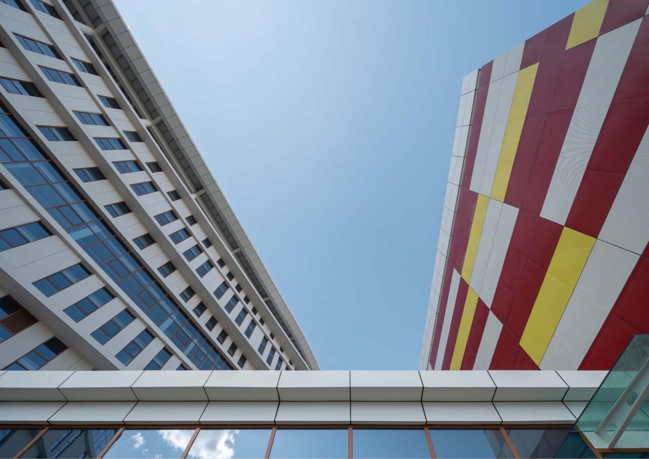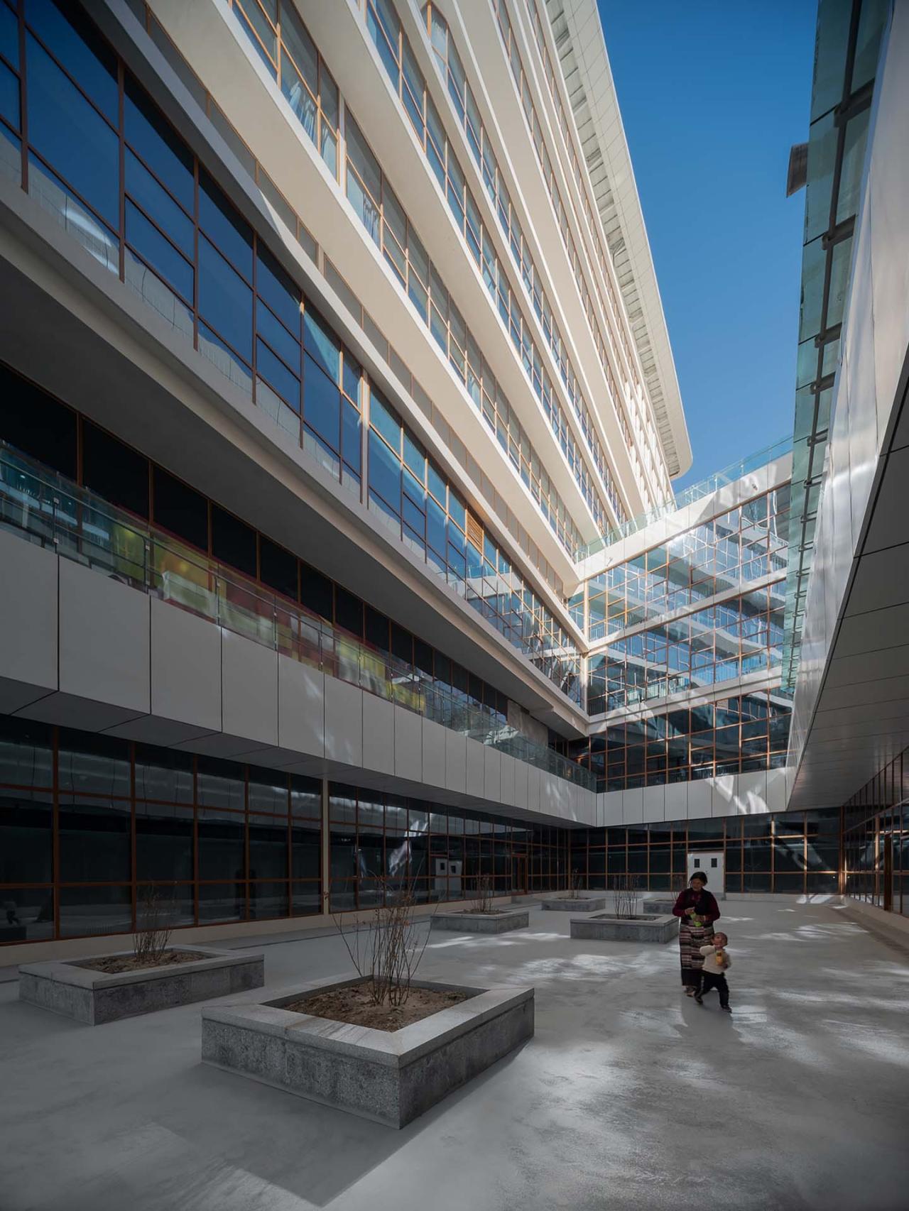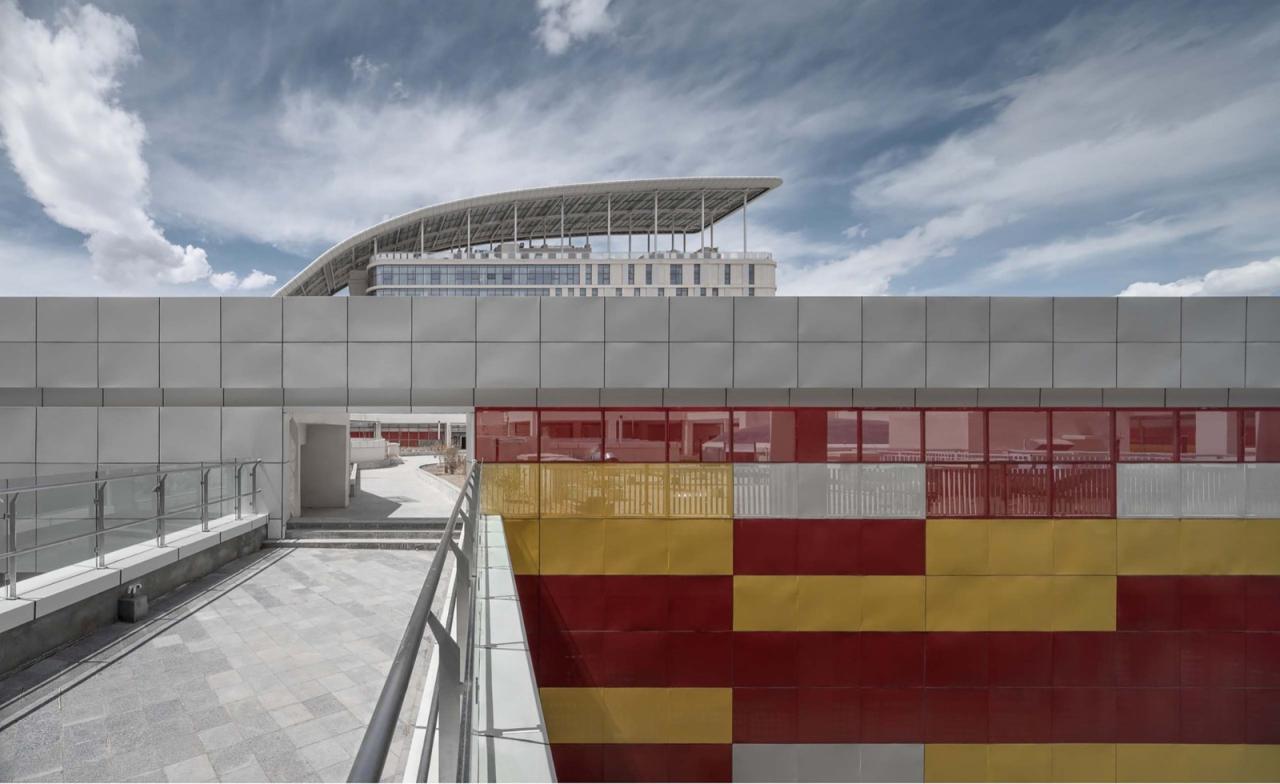舞动的哈达从空中看西藏自治区妇产儿童医院像两条吉祥的哈达在舞动——舞动的哈达;(在藏民族文化中,敬献哈达是一项传统又崇高的礼节,哈达代表了吉祥、祝贺的寓意。)舞动的哈达南北两翼分别是儿童综合楼和妇女保健综合楼(儿童吵闹、好动又是患者,产妇则需要安静和闲适而且不是病态,适合南北分开),中央多彩的大楼是共享的医疗核心组团。新落成的西藏自治区妇产儿童医院采用国际先进的理念,拥有国内先进的医疗设备配置,赋有地域的文化特色。