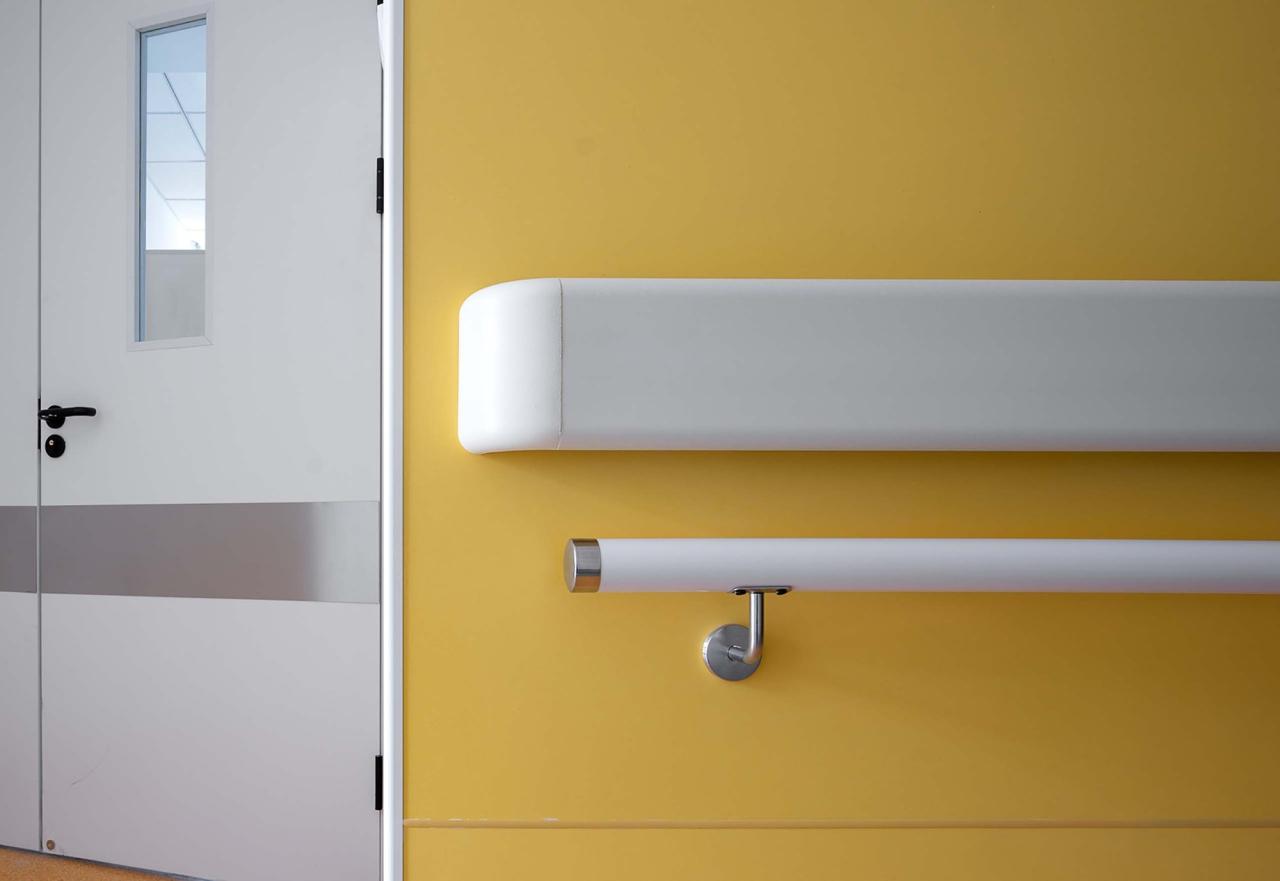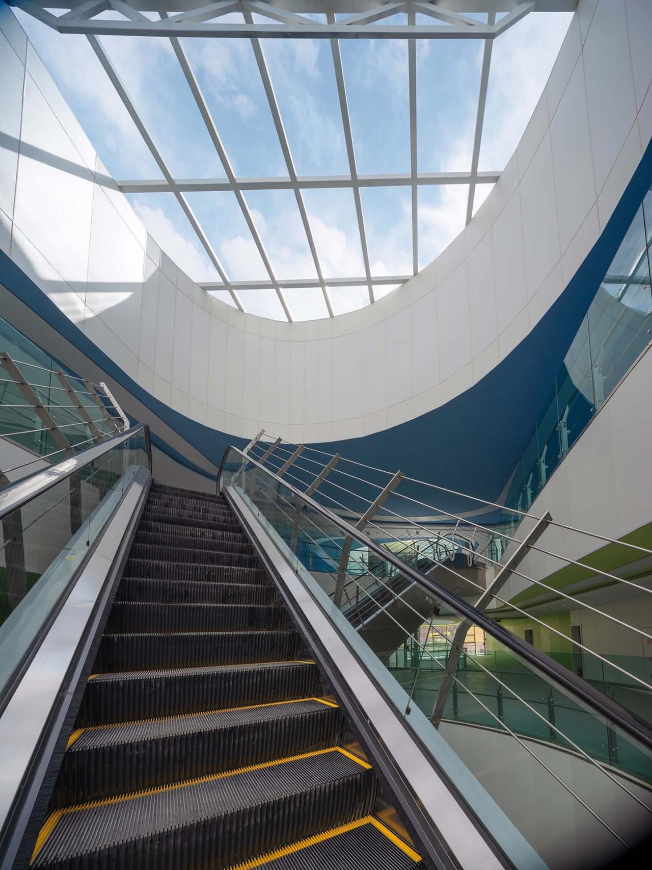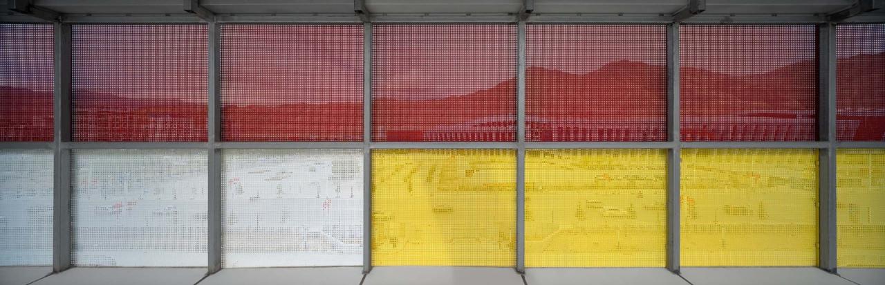 错落颜色的穿孔板灵感来自于藏文化的多彩,这个多彩既是室外景色的框景,又是室内处处的抵景。大厅里的三种颜色,深蓝代表海洋,绿色代表森林,浅蓝代表天空。儿童部分用绿色,可以使得他们更加安静;产妇部分用橙色,可以使他们更加温馨。(色彩系统贯穿未来物品和文件管理)。